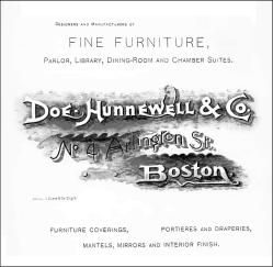 Elias R. Hunnewell was proprietor of Doe, Hunnewell & Co., manufacturers and dealers in furniture. The company previously had been located at 577-579 Washington, where it had both manufactured and sold its furniture. In September of 1886, Elias Hunnewell had sublet the Washington Street property to Col. M. C. Clark, who subsequently remodeled it into a hotel. Doe, Hunnewell & Co. moved its manufacturing the South End and its display and sales room to 4 Arlington.