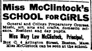 In about 1908, 4 Arlington became McClintock’s School for Girls, operated by Miss Mary Law McClintock. A native of Newberry County, South Carolina, she had taught English at the Florida Agricultural College from 1896 to 1901, and later served as a principal at Mount Ida College in Newton. The school continued to be located at 4 Arlington until her death in January of 1925.