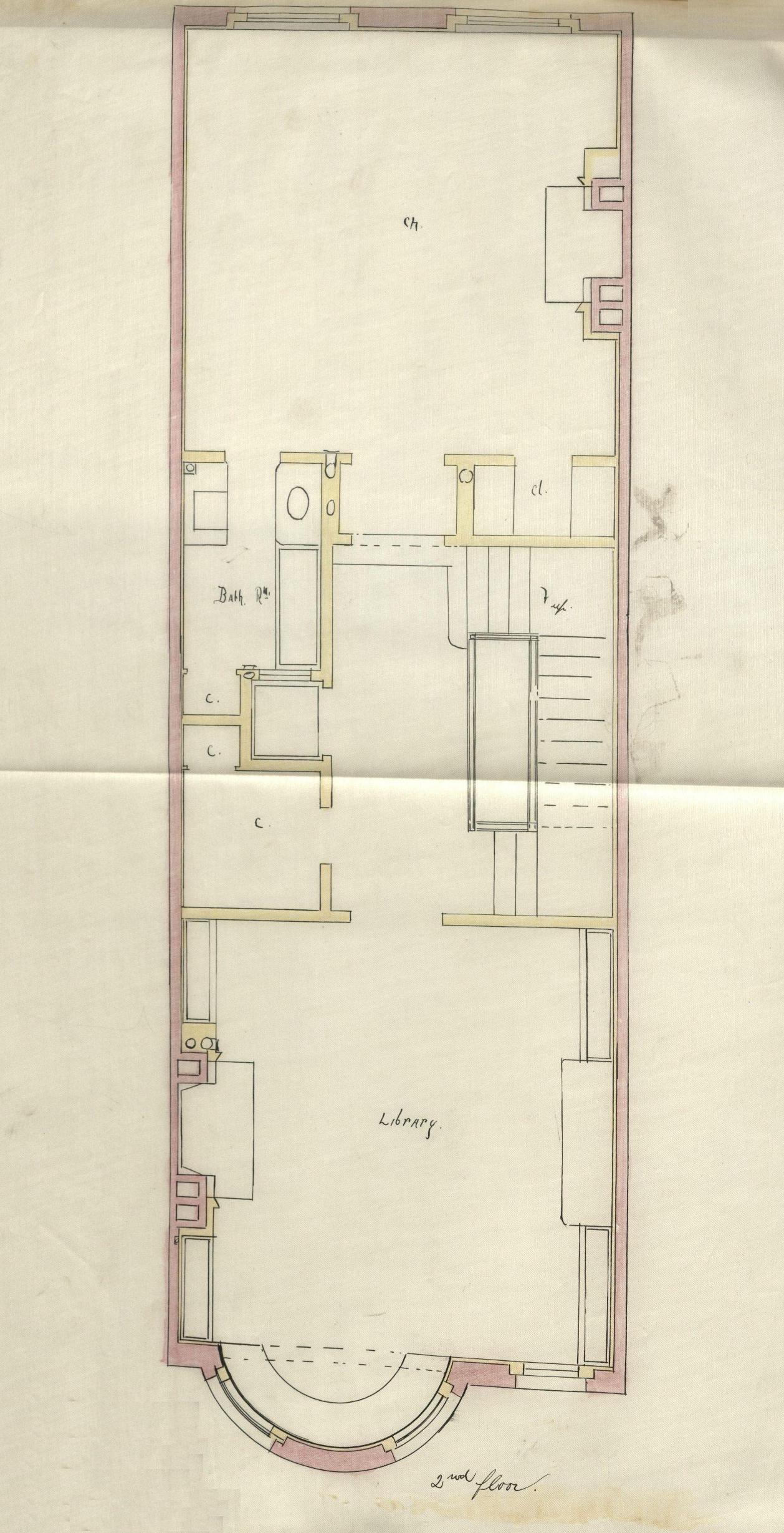 Second floor plan of 503 Beacon, bound with the final building inspection report, 24Nov1888 (v. 26, p. 27); Boston City Archives