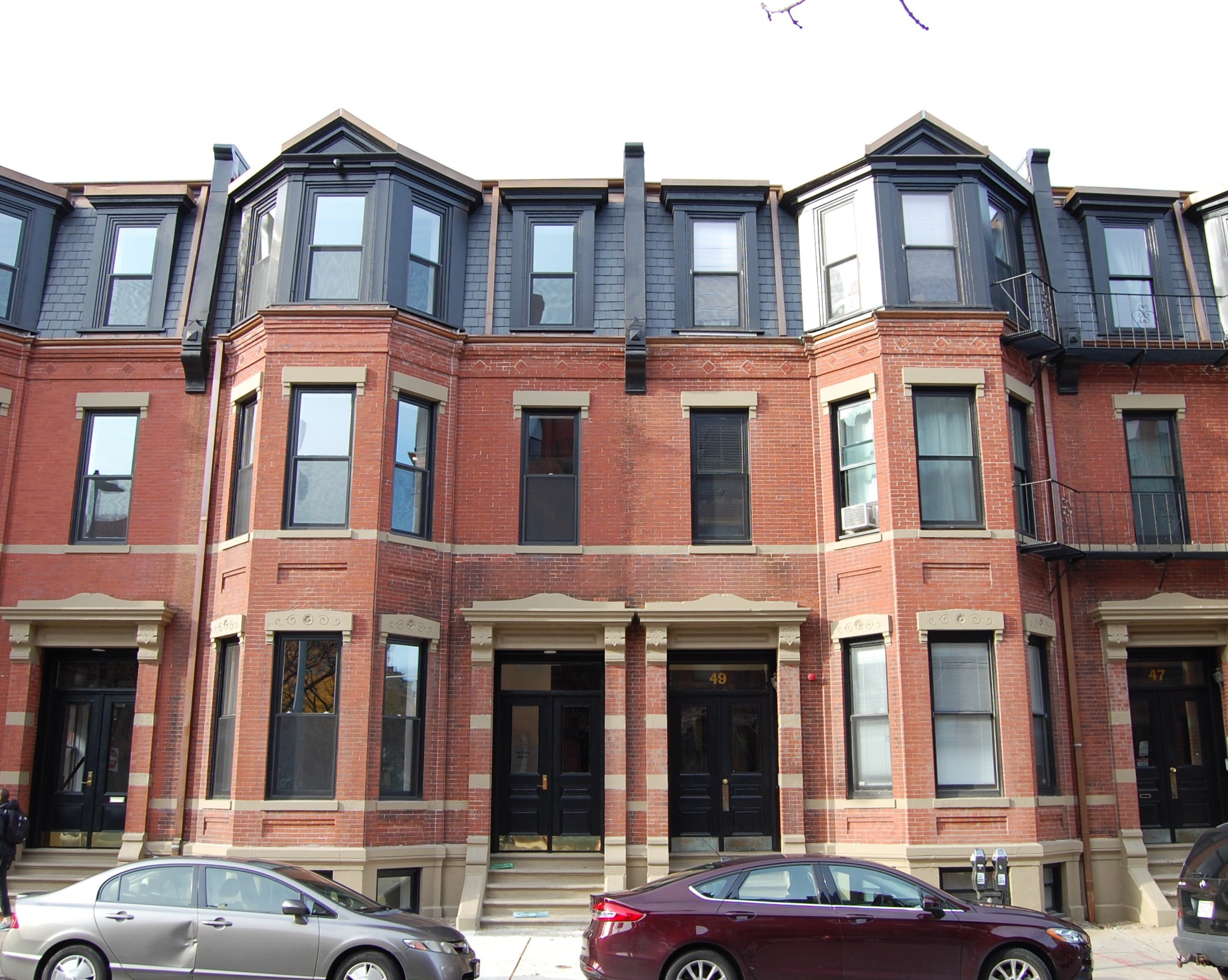 On February 18, 1882, George Wheatland, Sr., sold the land to Warren D. Vinal and Charles A. Dodge, the builders. On the same day, they subdivided the land into five lots and entered into a mortgage with George Wheatland, Jr., on each lot, probably to provide the funds for the construction. In November of 1882, after the houses were completed, Vinal and Dodge sold 45 Hereford and 53 Hereford to individual buyers, and in February of 1883, they sold 47-49-51 Hereford to real estate dealer Brice S. Evans. He sold 51 Hereford in August of 1883, but 47 and 49 Hereford remained unsold, and on April 4, 1884, George Wheatland, Jr., foreclosed on his mortgages to Vinal and Dodge, which had been assumed by Brice Evans, and took possession of the two houses. He sold them later in 1884.