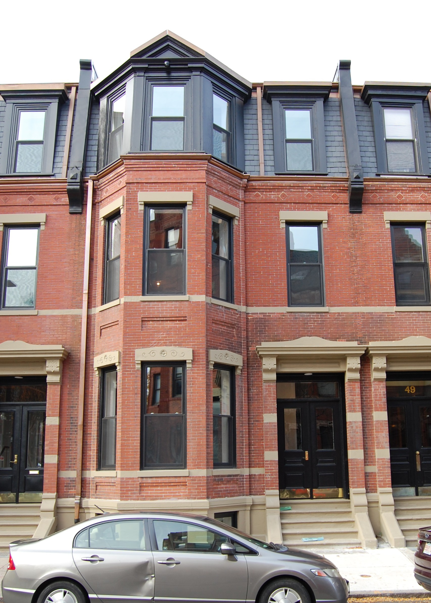 The block of Newbury between Hereford and West Chester Park (Massachusetts Avenue) was intended primarily for stables, including private carriage houses and larger public livery stables, and in 1882, when 45-53 Hereford were built, there already were several stables directly across the street, on the south side of Newbury. 53 Hereford was designed with a window-less wall on Newbury, probably to avoid looking onto these stables and to firmly orient 45-53 Hereford in an eastward facing direction, as a residential block of buildings.