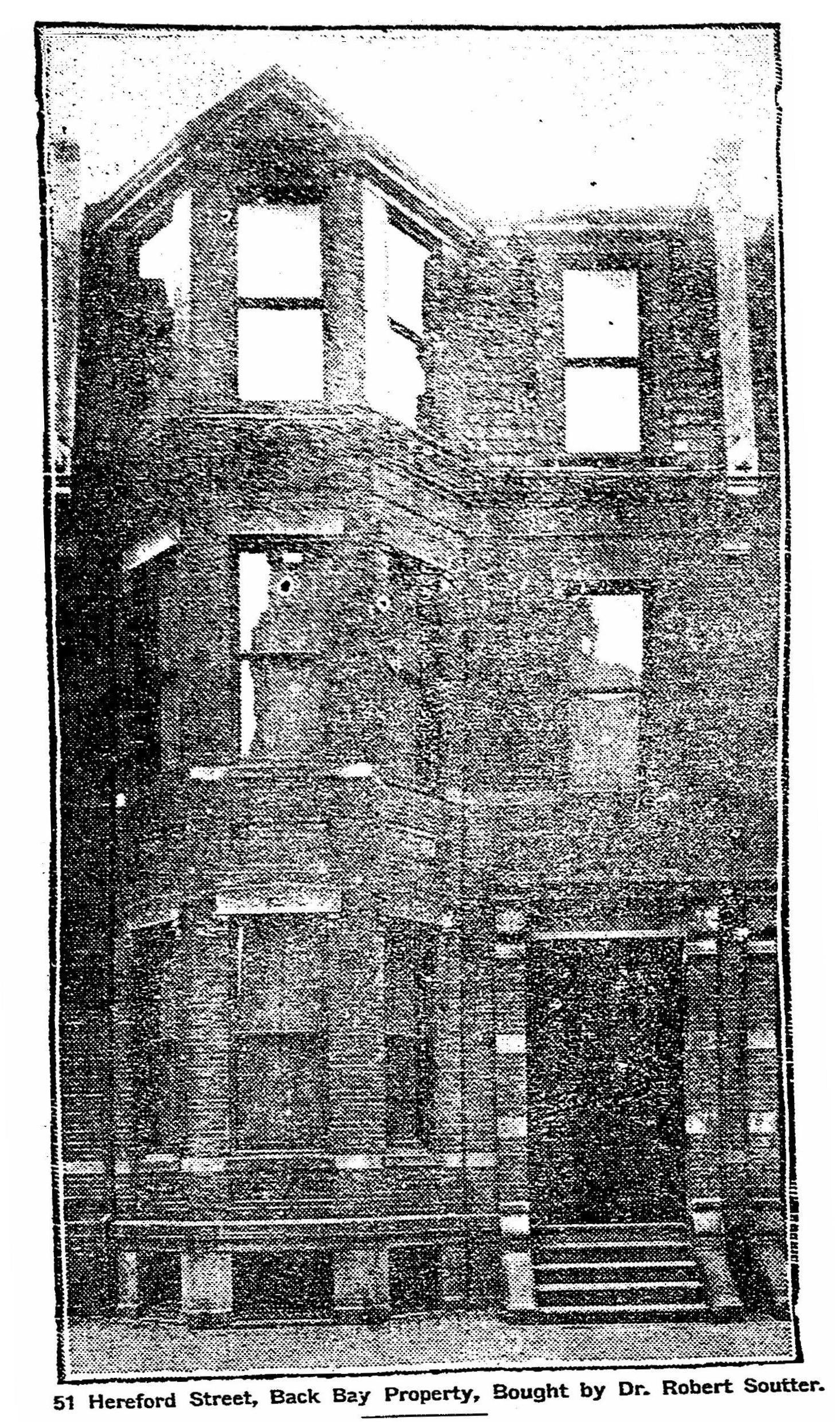 In April of 1909, the Soutters purchased and subsequently moved to 53 Hereford. Dr. Vose and J. D. Cameron Bradley moved with them. The Soutters continued to own 51 Hereford, leasing it to others. On October 6, 1913, Robert Soutter transferred 51 Hereford and 53 Hereford into Helen Soutter’s name.