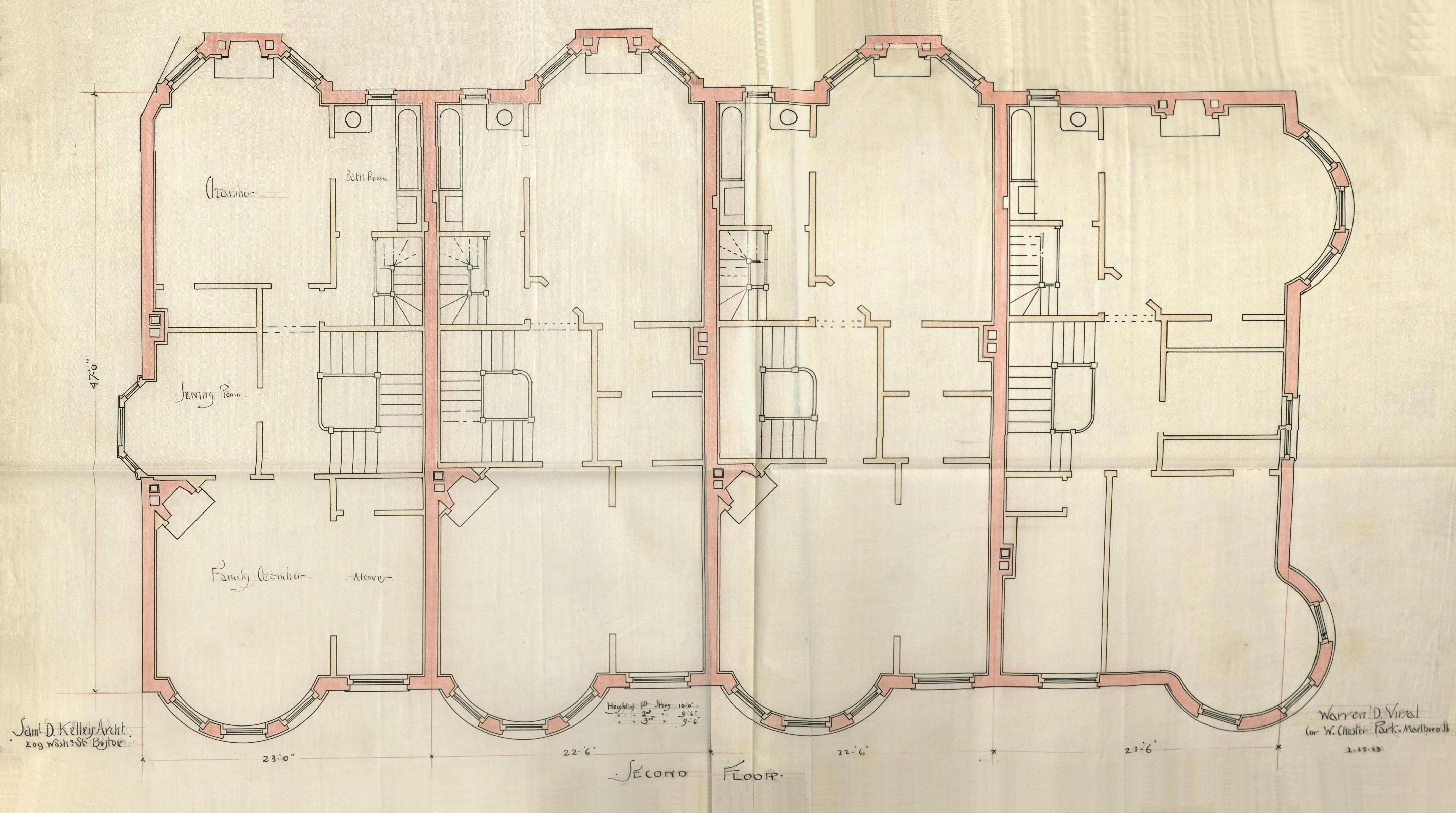 On June 8, 1889, the Boston Globe reported on 47-49-51 Marlborough and 424 Marlborough, noting that they were due to be completed on September 1. “W. D. Vinal, owner and builder, is erecting … three swell front, three-story private dwellings, the basement being of stone, the remainder of brick, with Longmeadow trimmings, finely hammered. … One house has two copper bays upon its side, and all are to have hard wood finish, the first three floors to be dadoed, with three open fireplaces upon each story. W. D. Vinal is the mason; O. H. Drisko & Son, carpenters, and Mr. Kelley the architect. … At the corner of Chester Park street and Marlboro street the same owner is erecting yet another house of similar general design, with the exception that the corner is to be built in the form of a half-circle, and it is to have two street fronts.”