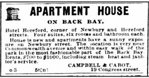 Edwin Horn purchased the land for 46-48-50-52 Hereford on April 21, 1885, from Caleb H. Warner and Charles F. Smith, trustees. The parcel had been part of a tract of land originally purchased by Nathan Matthews on January 2, 1871, from David Sears, Jr., Frederick R. Sears, and Knyvet Sears.