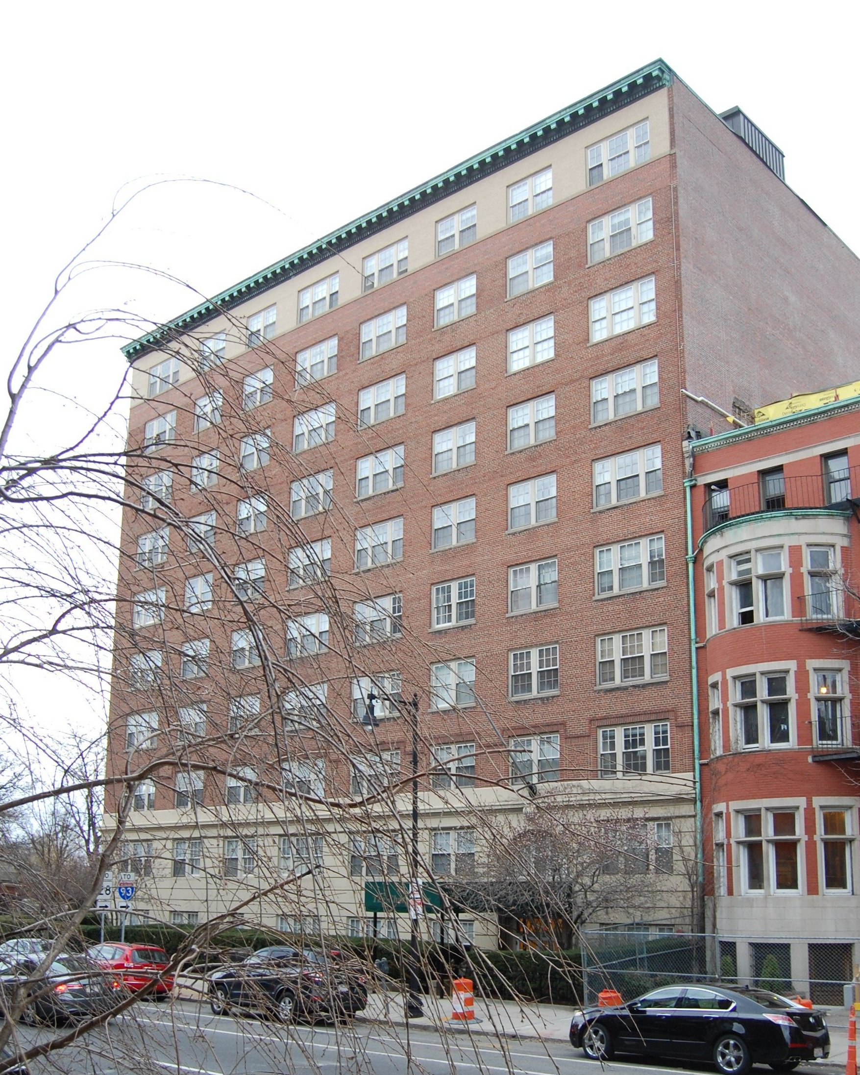 A May 10, 1923, Boston Globe article reported that the “exterior is to be of limestone and and red brick” and that it would be a “modern, first class non-housekeeping apartment house” containing “72 suites of one room and bath, one room and chamberette and bath, and two rooms and bath. Every room will be an outside one, and suites are arranged so that larger ones may be obtained if desired.”
