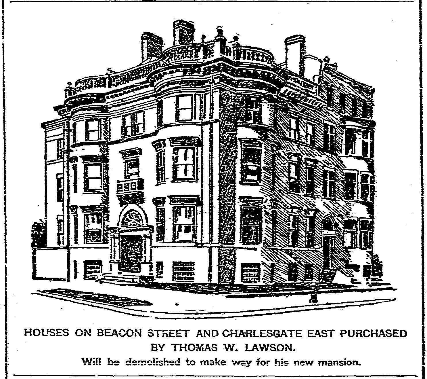 The July 18, 1899, Boston Globe article reporting the transactions comment that: “The last of the papers in the purchases of a site for a home on Beacon and Charlesgate East by Thomas W. Lawson, were passed yesterday. The purchase includes two modern brick and stone dwellings and an adjoining lot of vacant land. Mr. Lawson will have a total area of 13.581 feet, fronting on Beacon st., Charlesgate east, and on the Charles river. The two buildings, the present homes of William S. Bryant and Hon. Francis W. Kittredge, will be torn down and a magnificent dwelling erected on the site. A representative of Mr. Lawson said yesterday that plans were now being drawn for the new home, but that nothing in the way of actual building operations would probably be done until after the coming winter.”