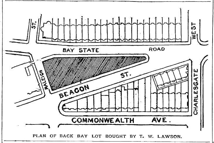 Plan of triangular lot at Beacon and Bay State Road purchased by Thomas W. Lawson on 11Jul1901; Boston Herald, 19Jul1901