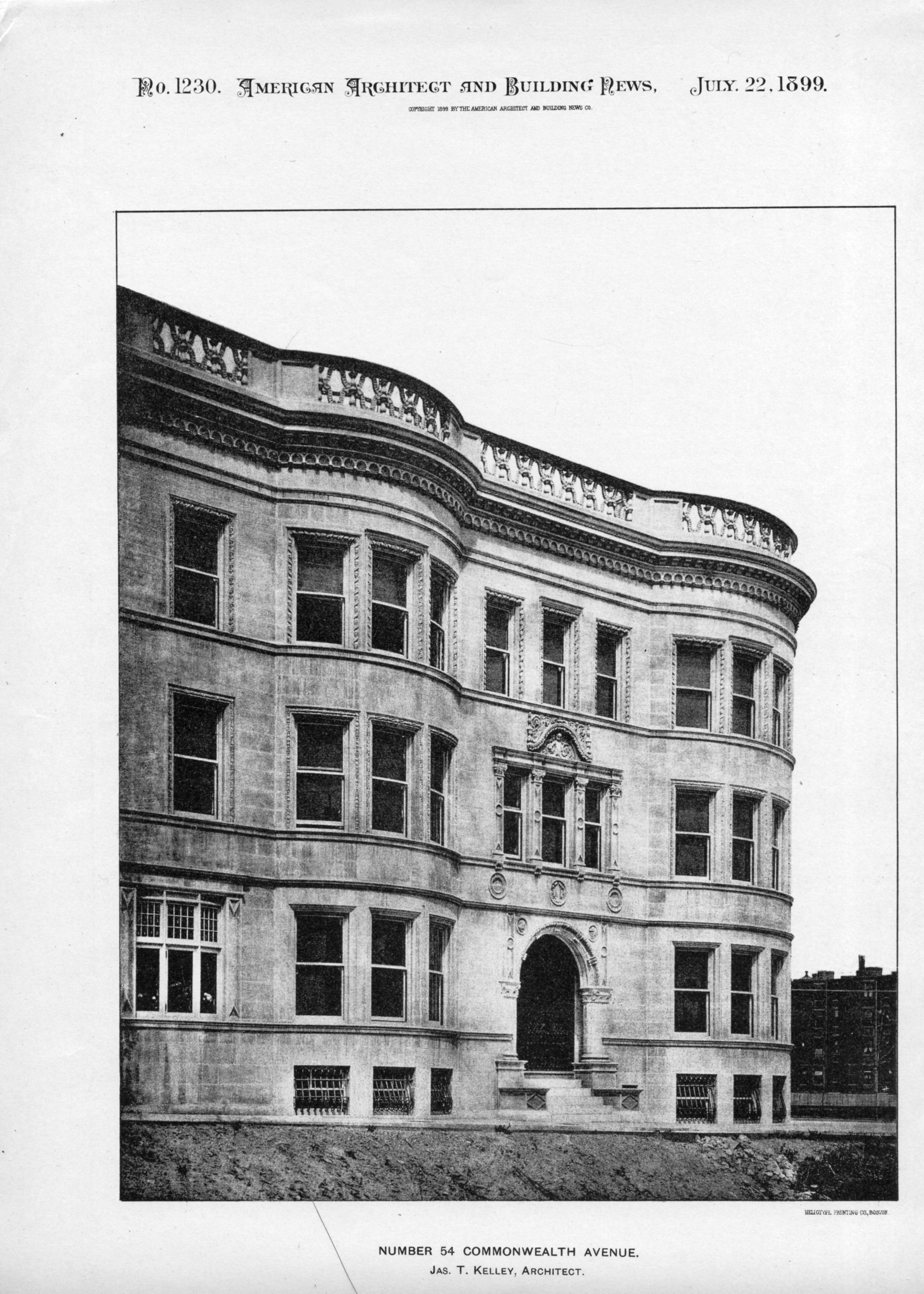 In its July 22, 1899, issue, the American Architect and Building News published two photographs of a recently-completed building identified as “Number 54 Commonwealth Avenue” designed by James T. Kelley. One photograph was of the front façade and the other of the entrance. The only mention in the text of the journal is the reference to the illustrations, in which it is described as “No. 304 Commonwealth Ave., Boston, Mass.”