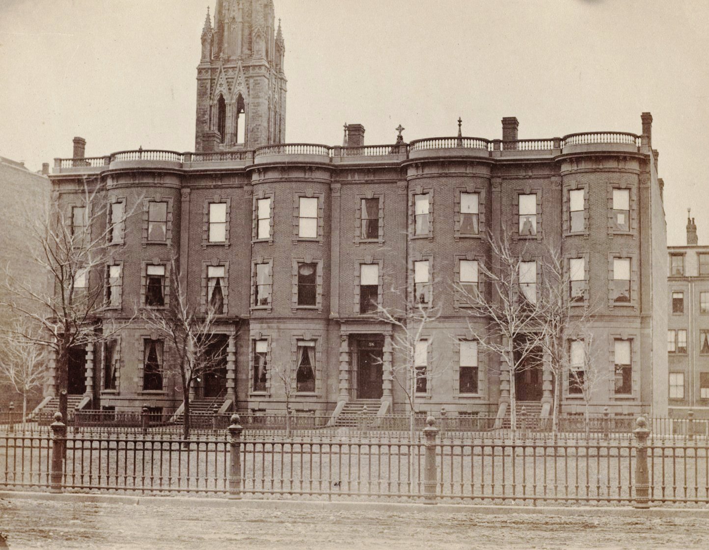 56 Commonwealth was built as the home of Maria (Francoeur) Sayles, the widow of Willard Sayles, a textile manufacturer and merchant, on land she purchased from the Commonwealth of Massachusetts on January 4, 1866. At the same time, her son, banker and broker Henry Sayles, had 58 Commonwealth built next door to the west, and her son-in-law and daughter, Dr. John Cauldwell Sharp and Helen Sharp, had their home built next door to the east, at 54 Commonwealth. Henry Sayles lived only briefly at 58 Commonwealth, if at all, and by 1868 was living with his mother at 56 Commonwealth. He was unmarried. In 1869, Maria Sayles’s son-in-law and daughter, John Reed Brewer and Caroline Francoeur (Sayles) Brewer, built 72 Commonwealth as their home, and in 1870, her daughter-in-law, Jane Hereford (Hallett) Sayles, the widow of Francis Willard Sayles, built 74 Commonwealth as her home.