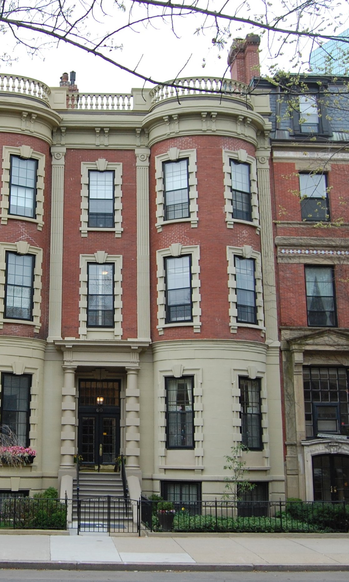 60 Commonwealth was designed by Snell and Gregerson, architects, and built ca. 1866 by Standish and Woodbury, masons, one of four contiguous homes (54-56-58-60 Commonwealth) built at the same time in a Georgian Revival style, with bow fronts and balustraded parapets above the main cornice. 54 Commonwealth was demolished in 1936 and 56 Commonwealth was demolished in 1930.