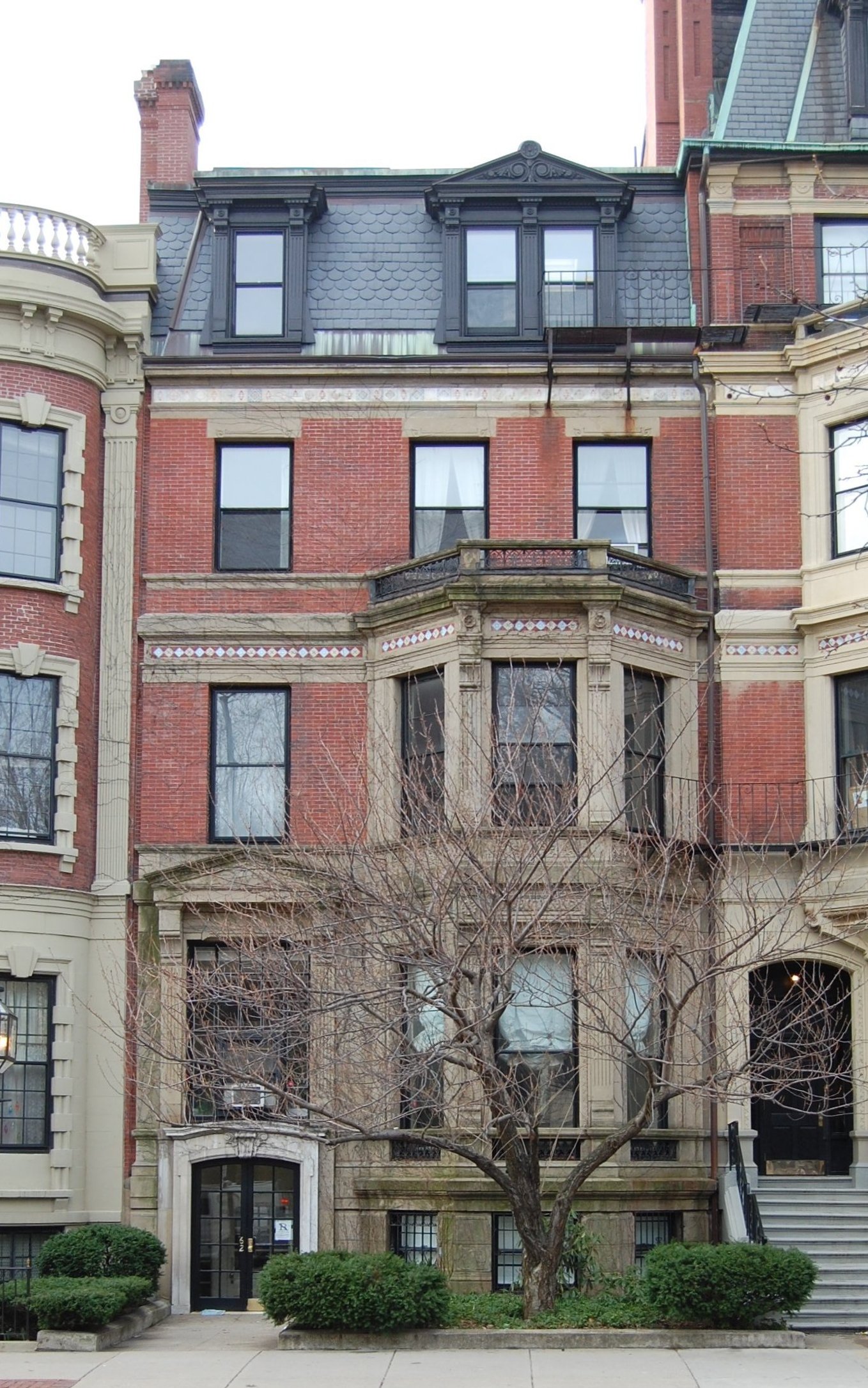 62 Commonwealth was built in 1871-1872, one of three contiguous houses (62-64-66 Commonwealth). The three houses form a symmetrical composition, with 64 Commonwealth, in the center, a full story higher with a tall mansard roof ornamented with iron cresting. The flanking houses at 62 and 66 Commonwealth are mirror images of each other. Horizontal string courses of stone unify the façade.