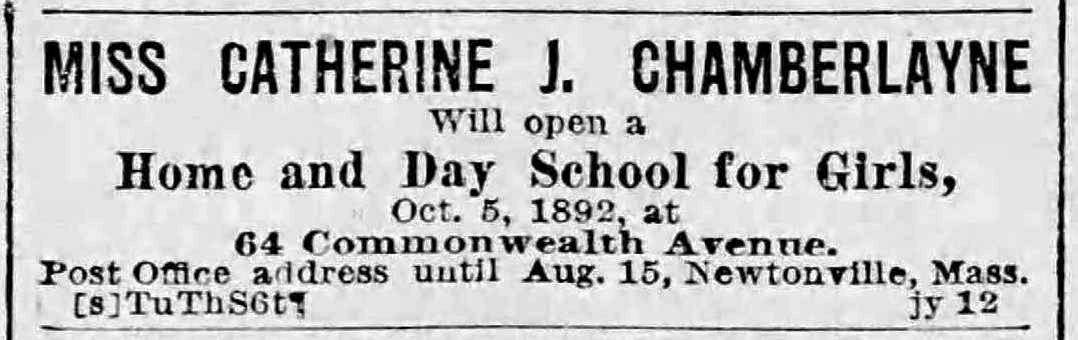 In the autumn of 1892, 64 Commonwealth became the home of Miss Catharine (Catherine) Jane Chamberlayne. She was founder and principal of Miss Chamberlayne’s School for Girls, which she operated at 64 Commonwealth. She was joined by Miss Mary E. Tappan, who taught in the school and served as assistant principal. They lived and operate the school at 64 Commonwealth during the 1895-1896 winter season, but moved thereafter to 253 Commonwealth, where they continued to operate the school.