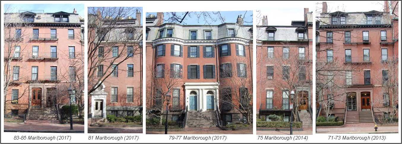 71-85 Marlborough were designed as a symmetrical composition. In the center are 77 and 79 Marlborough, with bow fronts and entrances that mark the mid-point of the composition. 75 Marlborough and 81 Marlborough match each other and have a continuous cornice line with 77-79 Marlborough. 71-73 Marlborough and 83-85 Marlborough also match each other and form the ends of the composition. The symmetry of the composition has been diminished by the remodeling of the entrance and penthouse addition at 81 Marlborough, and by the visible roof deck railing at 85 Marlborough.