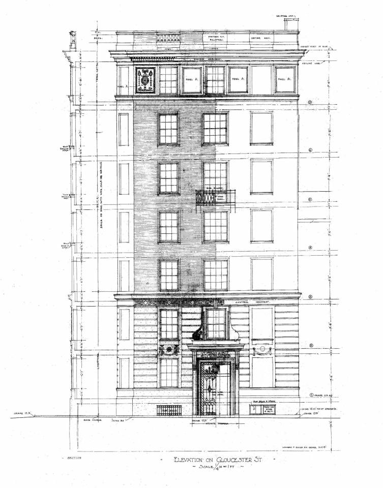Glou 008 – Gloucester Elevation (1912) BW ← Previous Next → Architectural rendering of the Gloucester Street elevation of 8 Gloucester, by architects Parker, Thomas, and Rice; courtesy of the Boston Public Library Arts Department, City of Boston Blueprints Collection