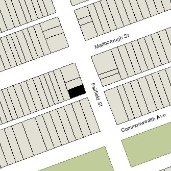 9 Fairfield is located on the west side of Fairfield, between Marlborough and Commonwealth, with 7 Fairfield to the north and 21 Fairfield to the south, across Alley 427.