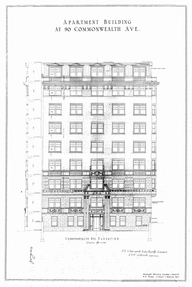 comm-090-front-elevation-1925-bw ← Previous Next → Architectural rendering of front elevation of 90 Commonwealth (1925) by George Jacob Nelson, architect; courtesy of the Boston Public Library