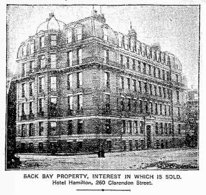 The Hotel Hamilton at 260 Clarendon (99 Commonwealth) was designed by Ware and Van Brunt, architects, and built ca. 1869. It was the first apartment building in the residential portion of the Back Bay, and it was among the earliest buildings to have an elevator.