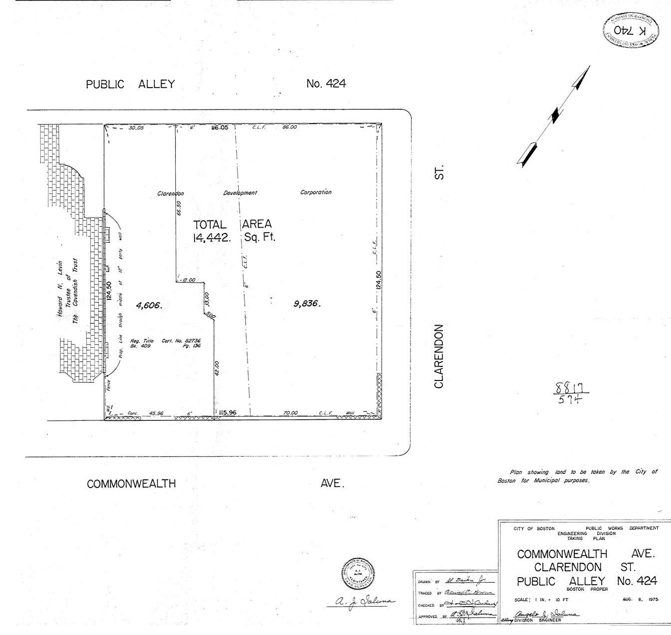 Plan of land at the northwest corner of Commonwealth and Clarendon taken by the City of Boston for use as a public park; Suffolk Co. Deed Registry, Book 8817, p. 574 (11Sep1975).