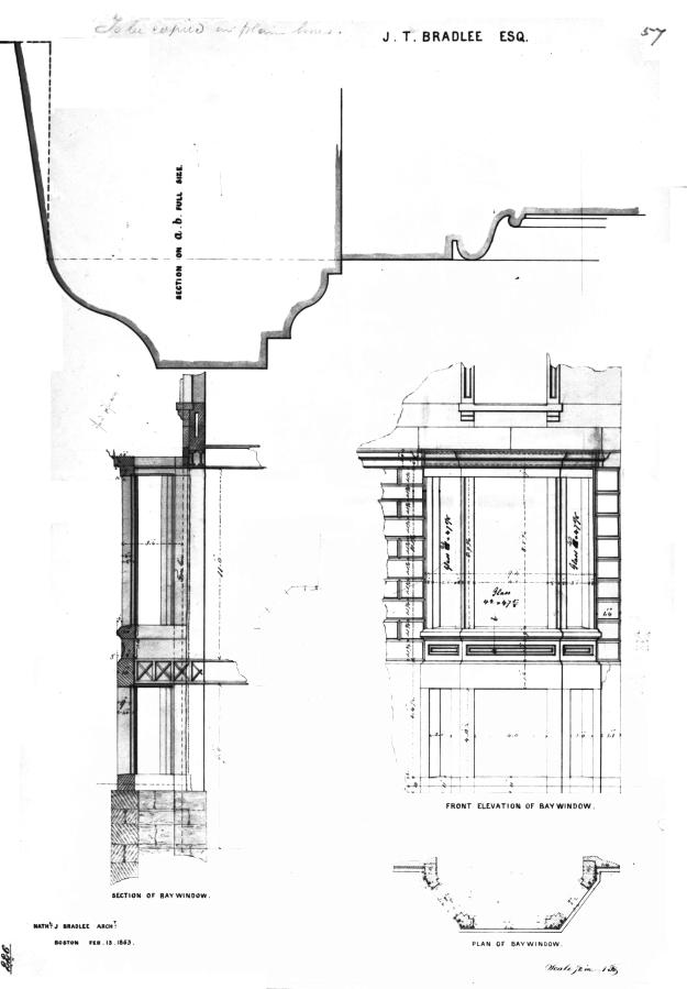 The photographs include drawings of the front and rear elevations, detail of the front bay windows, front entrances, and front freestone fences, floor plans for the basement and first through fifth floors, and framing plans for the first through fifth floor and the roof. Each drawing indicates Nathaniel J. Bradlee of Boston as the architect and J. T. Bradlee [John Tisdale Bradlee] as the client. Each drawing is dated, with the dates ranging from December 1, 1862, to February 13, 1863.