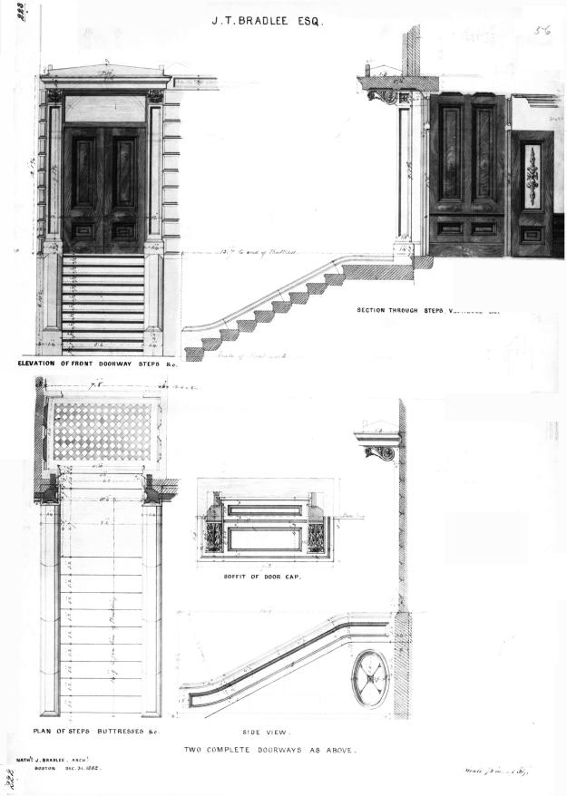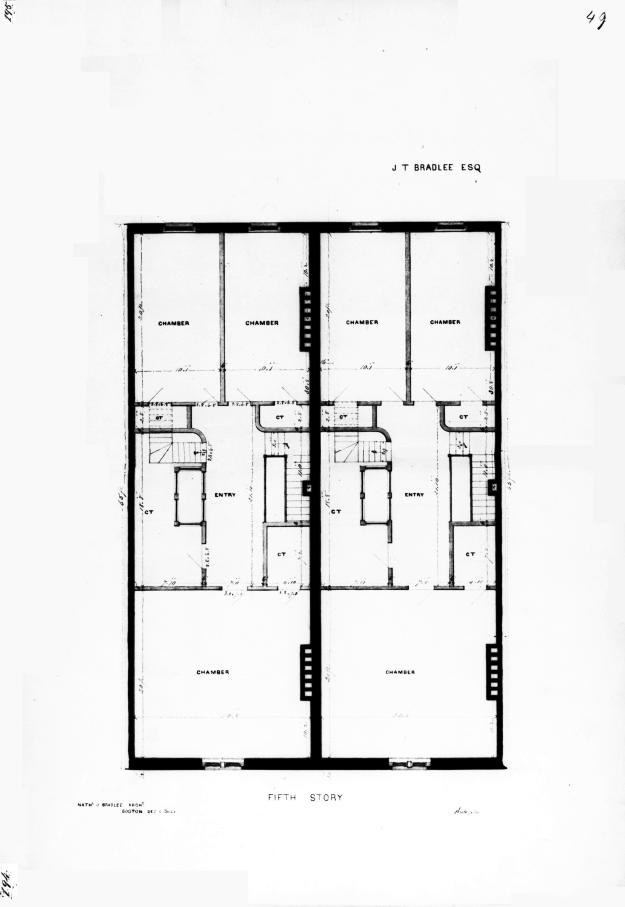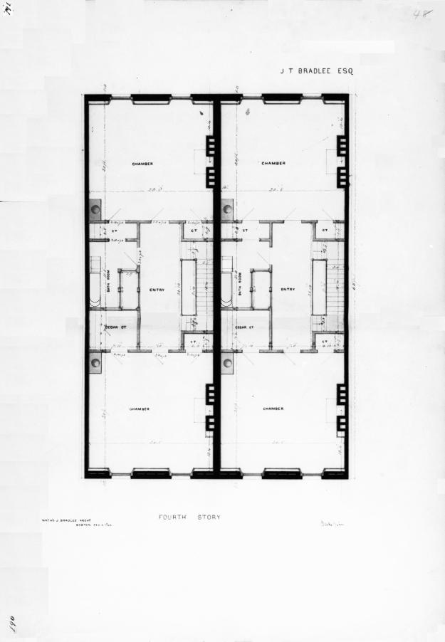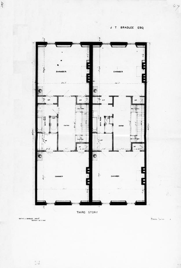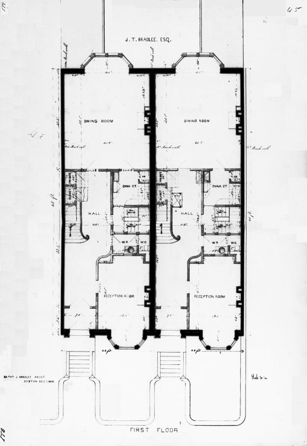 Nathaniel Bradlee’s plans for the houses were photographed by Bainbridge Bunting, author of Houses of Boston’s Back Bay: An Architectural History: 1840-1917 (The Belknap Press of Harvard University Press, Cambridge; 1967). The photographs were neither included in his book nor referenced.