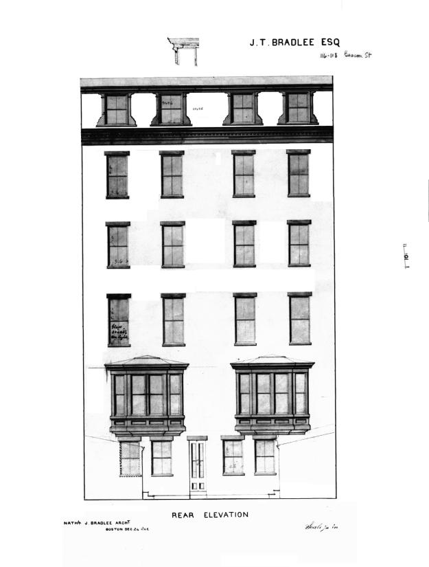 113-115 Beacon, rear elevation; drawing by Nathaniel J. Bradlee, architect, dated 24Dec1862; photograph from negative by Bainbridge Bunting (ca. 1942), courtesy of the Boston Public Library Arts Department and Digital Commonwealth