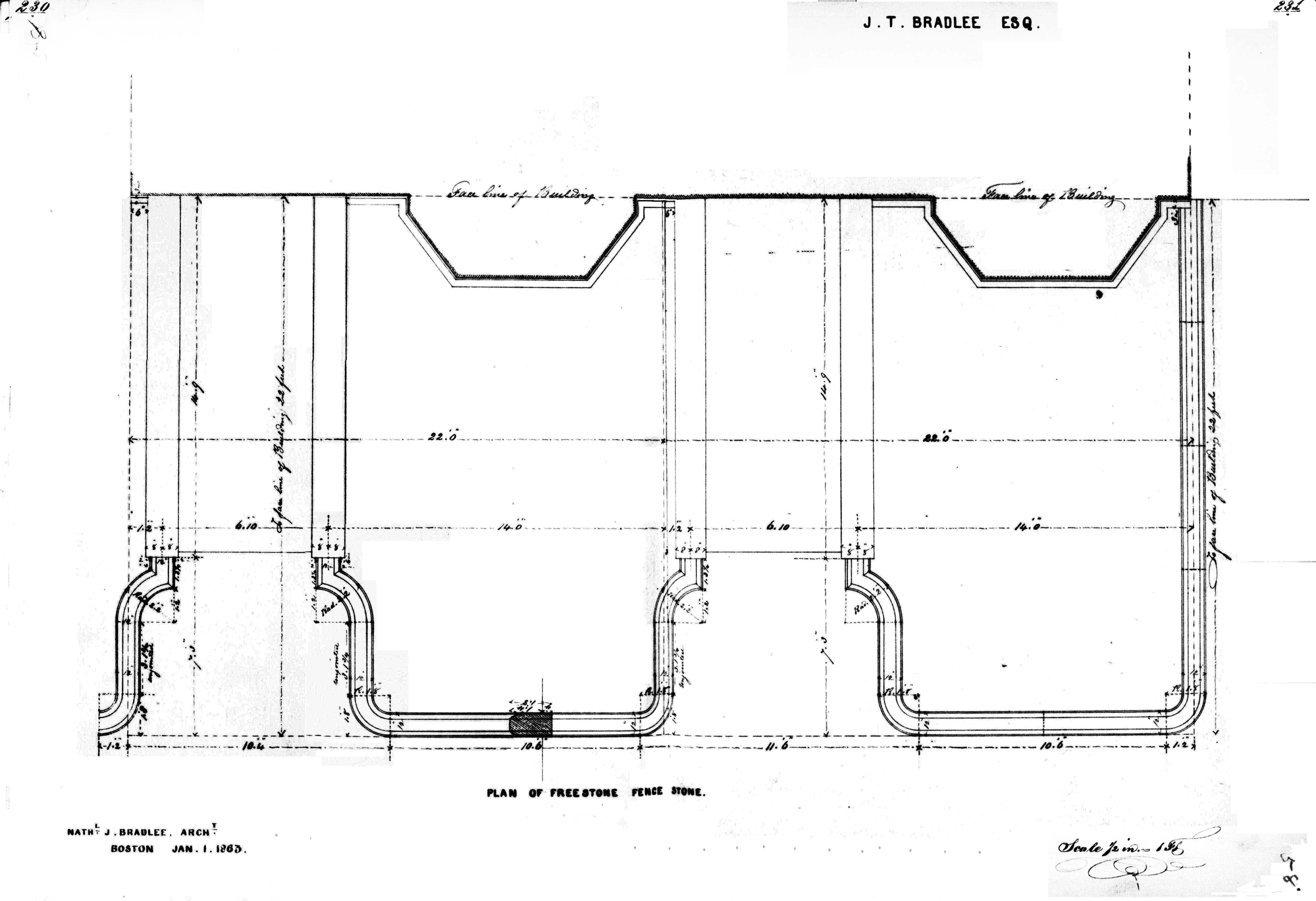 113-115 Beacon, detail of front yard freestone fences; drawing by Nathaniel J. Bradlee, architect, dated 1Jan1863; photograph from negative by Bainbridge Bunting (ca. 1942), courtesy of the Boston Public Library Arts Department and Digital Commonwealth