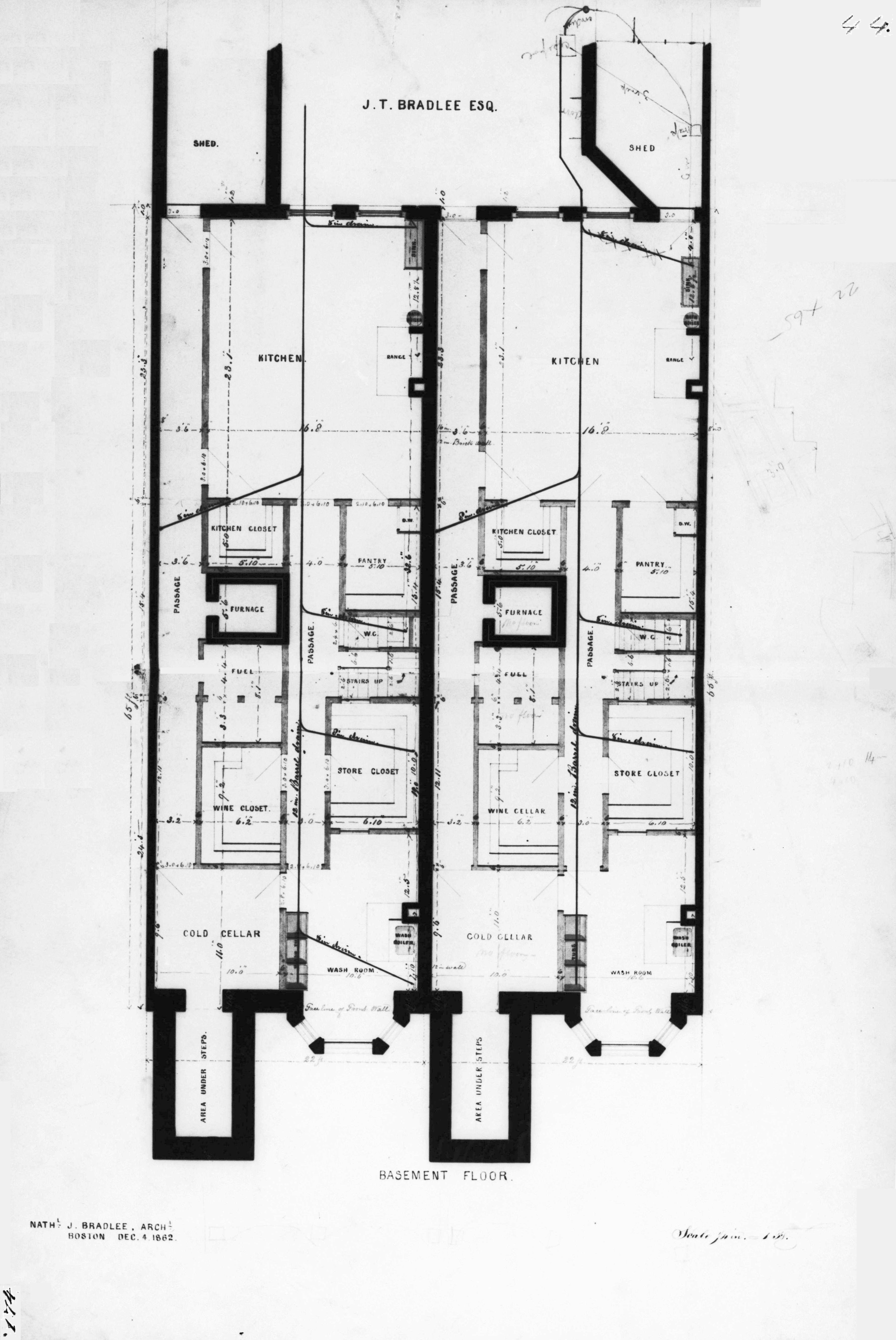 113-115 Beacon, basement floor plan; drawing by Nathaniel J. Bradlee, architect, dated 4Dec1862; photograph from negative by Bainbridge Bunting (ca. 1942), courtesy of the Boston Public Library Arts Department and Digital Commonwealth