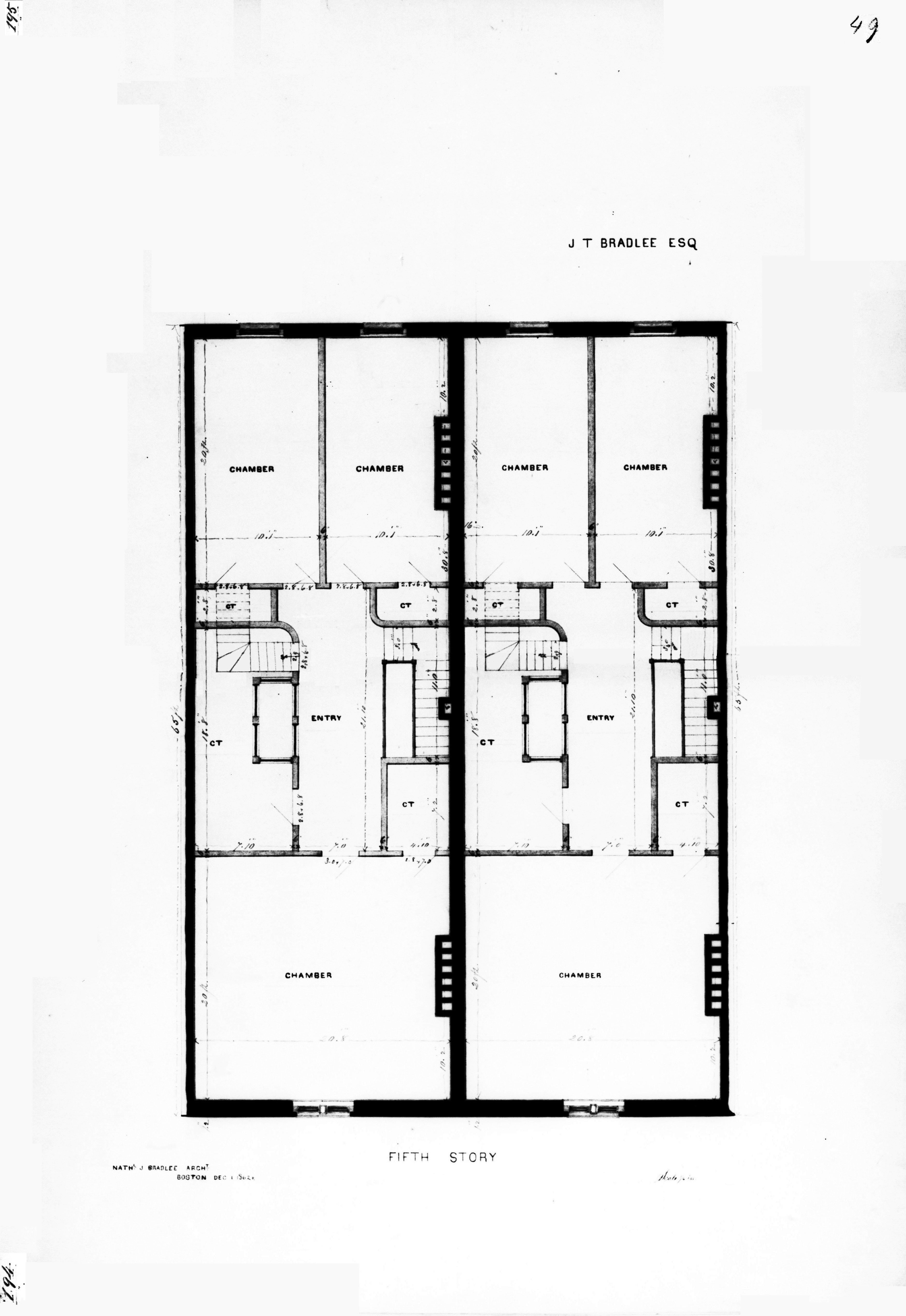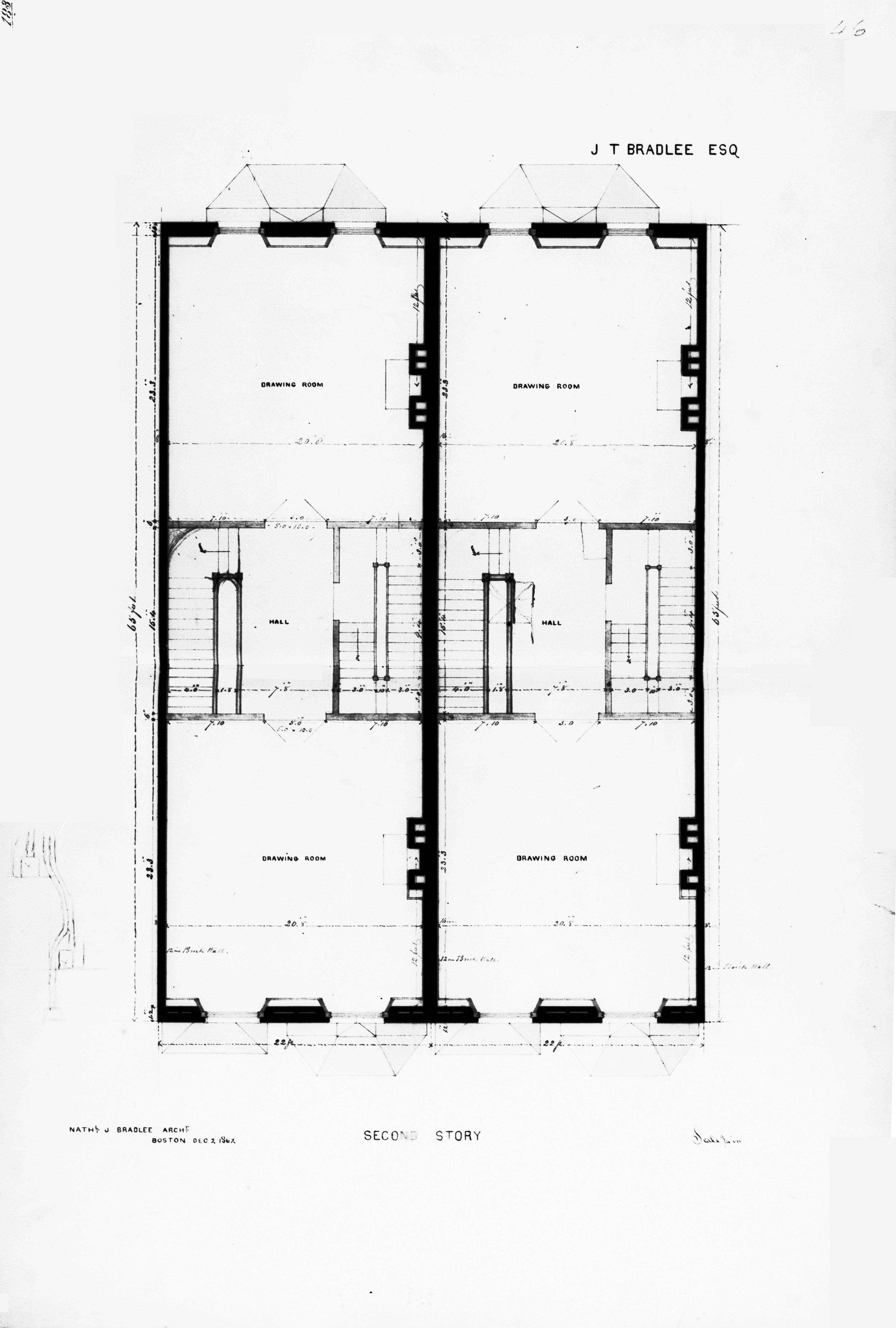 Nathaniel Bradlee’s plans for the houses were photographed by Bainbridge Bunting, author of Houses of Boston’s Back Bay: An Architectural History: 1840-1917 (The Belknap Press of Harvard University Press, Cambridge; 1967). The photographs were neither included in his book nor referenced.