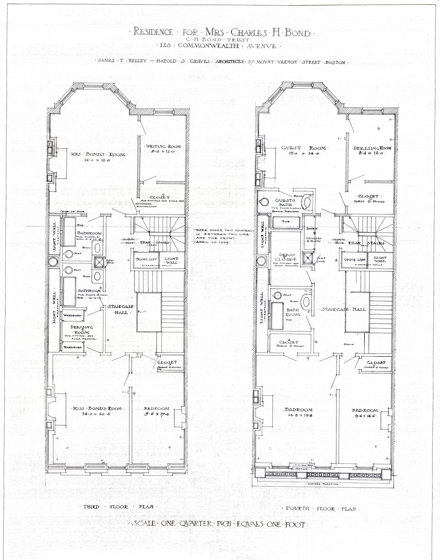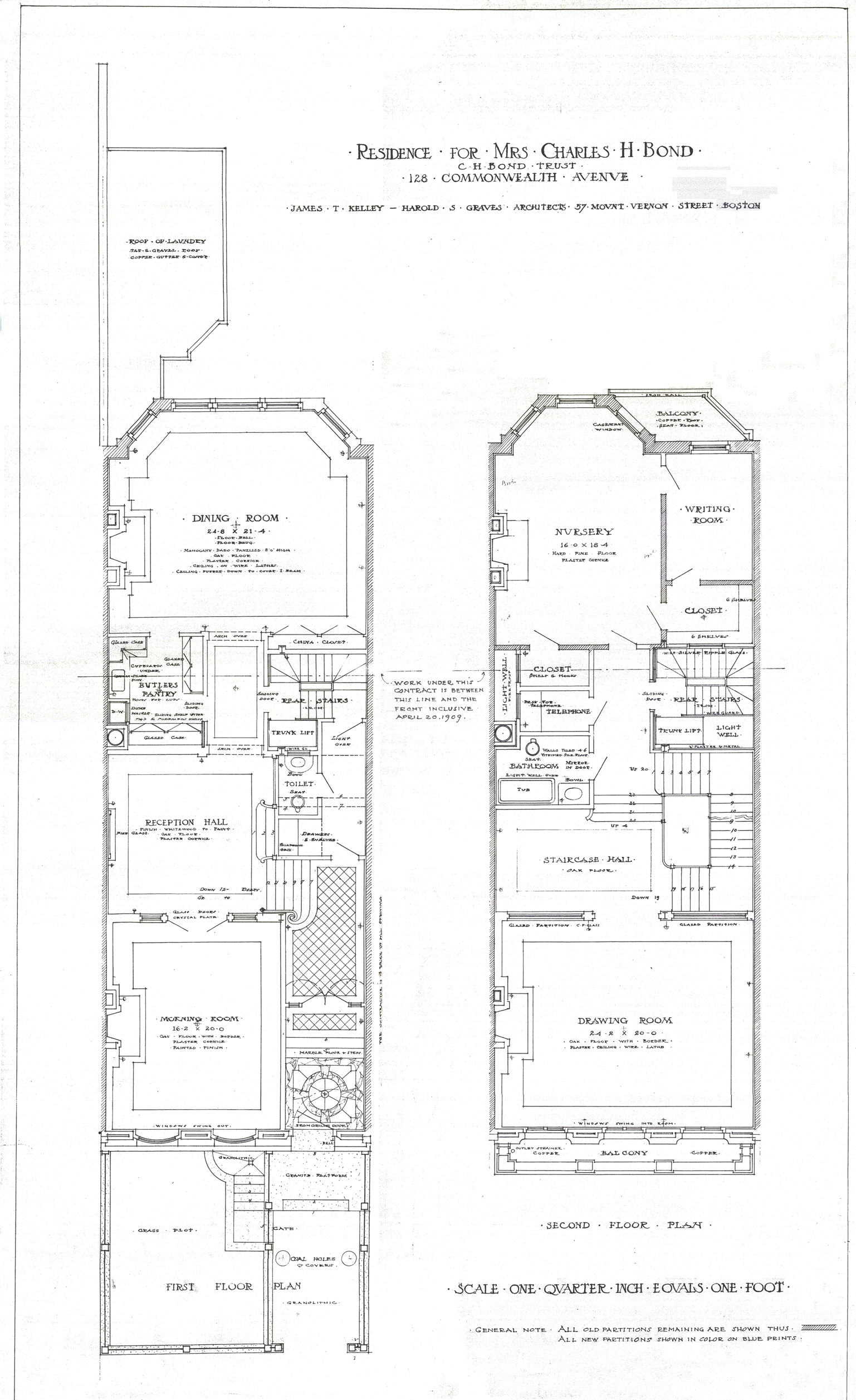 In April of 1909, architects James T. Kelley and Harold S. Graves prepared plans for remodeling 128 Commonwealth for Isabella (Bacon) Bond, the widow of Charles H. Bond.