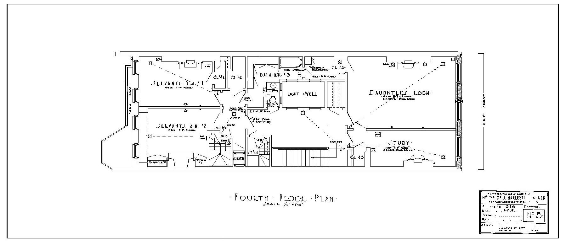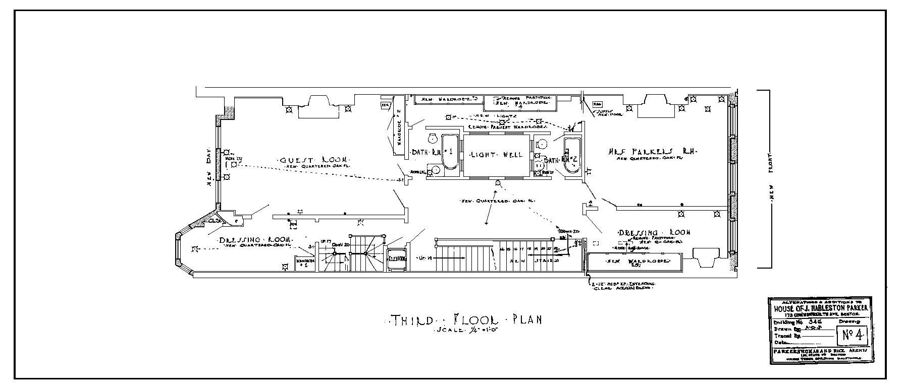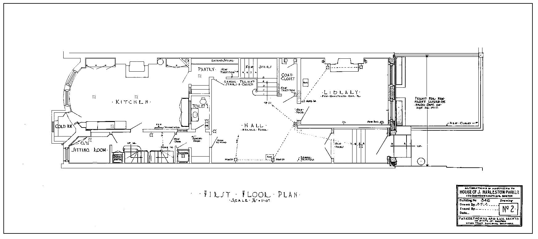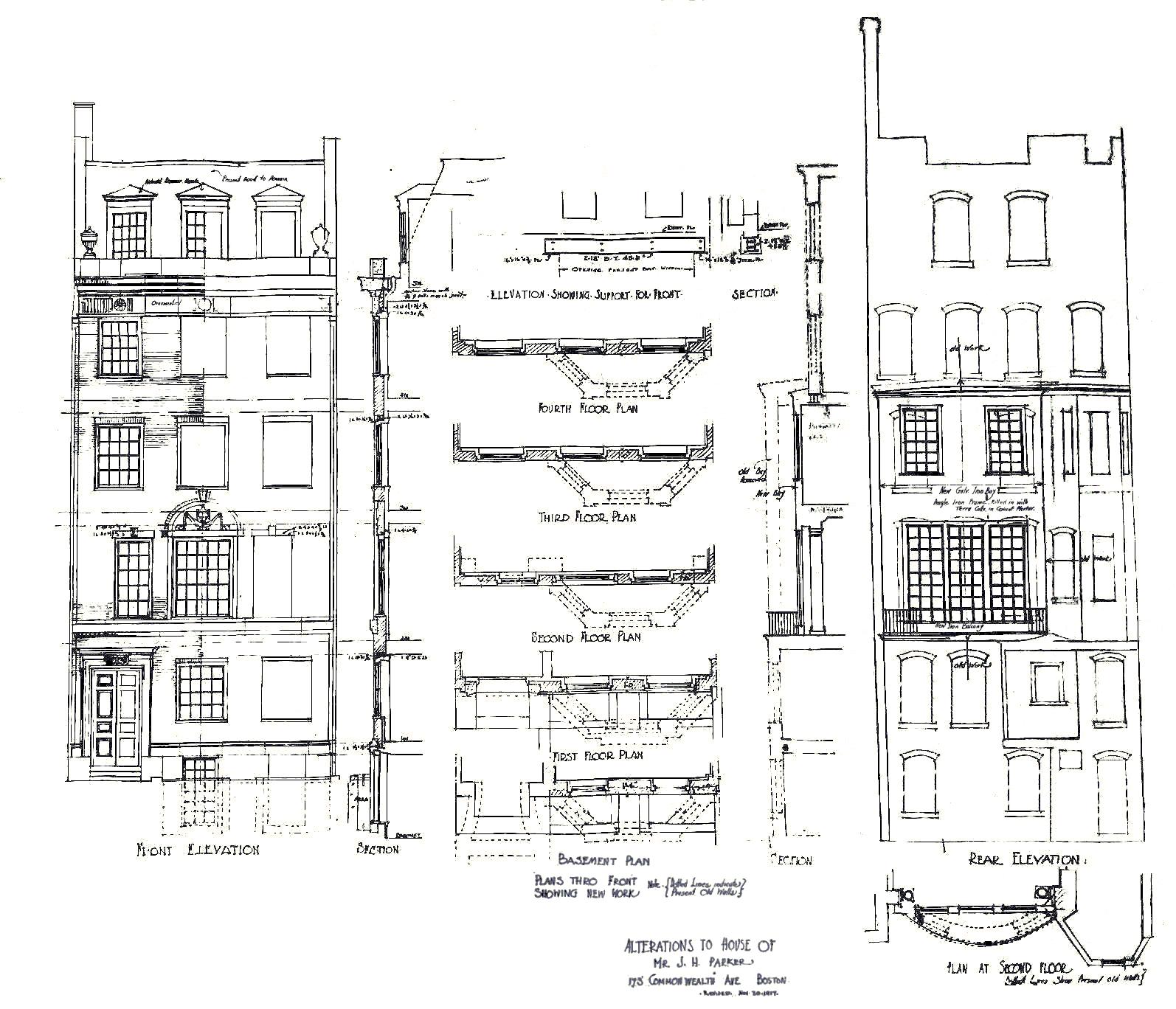 In November of 1917, architects Parker, Thomas, and Rice prepared plans for remodeling 173 Commonwealth to be the future home of their partner, J. Harleston Parker. The remodeling included replacing the front façade and portions of the rear façade, and significantly altering the interior.