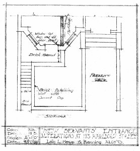The plans included a penthouse (or attic) addition with a mansard roof at the rear of building in which four servant’s bedrooms, a store room, and a bathroom were located. They also included a new bay window on first floor at the rear; a new “servants’ entrance” at the basement level in the front, and miscellaneous interior remodeling.