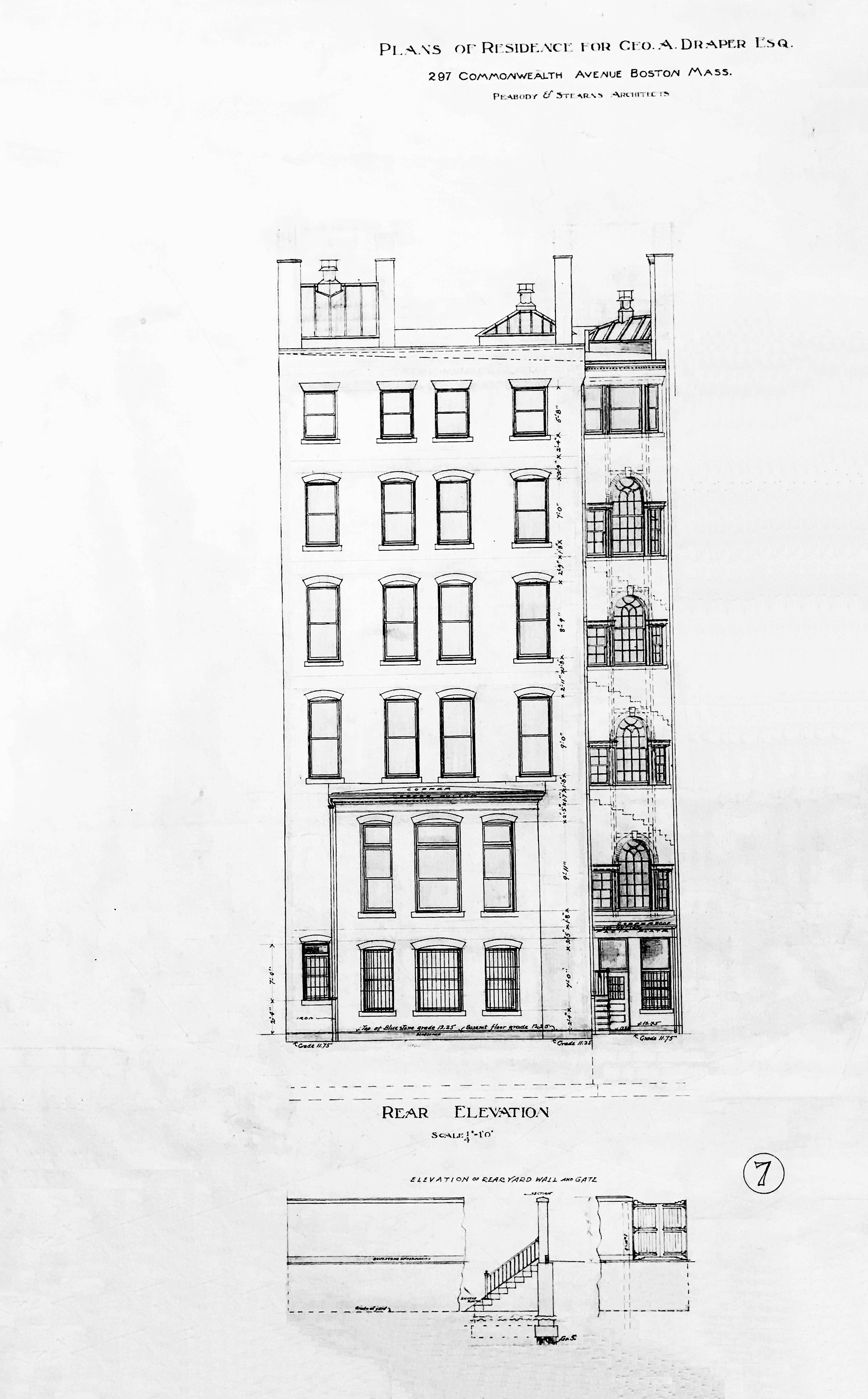 These images, provided courtesy of the Boston Public Library, include the front elevation, rear elevation, elevation of the western side of the house, showing the inset rear area, and elevation of the eastern side of the house, showing its relationship to the existing party wall with 295 Commonwealth, called “Wheatland Party Wall.”