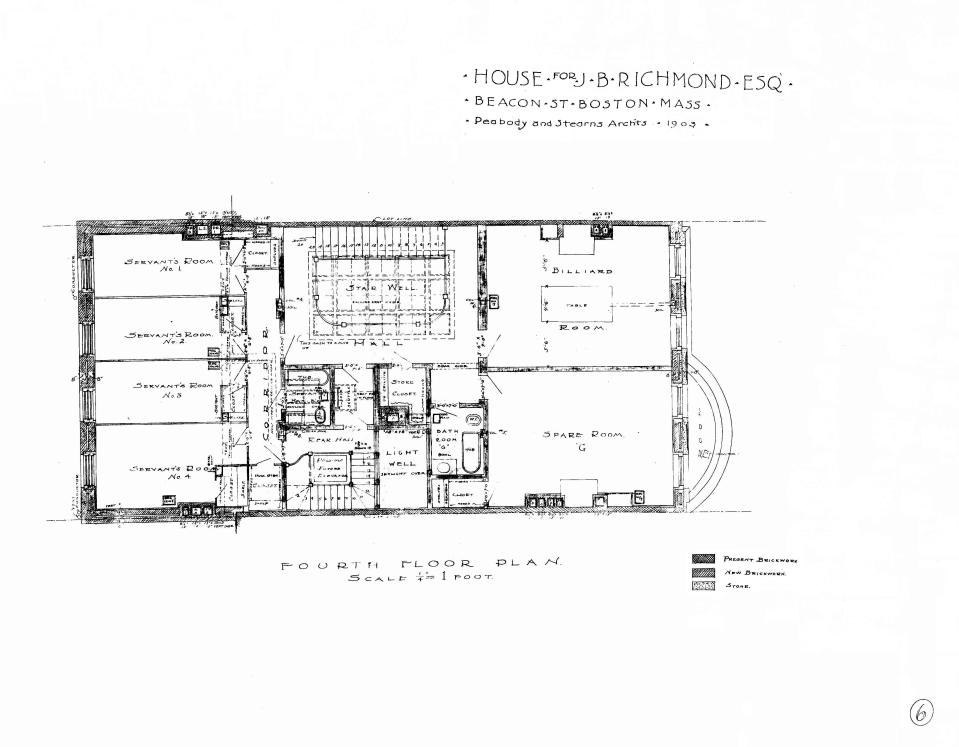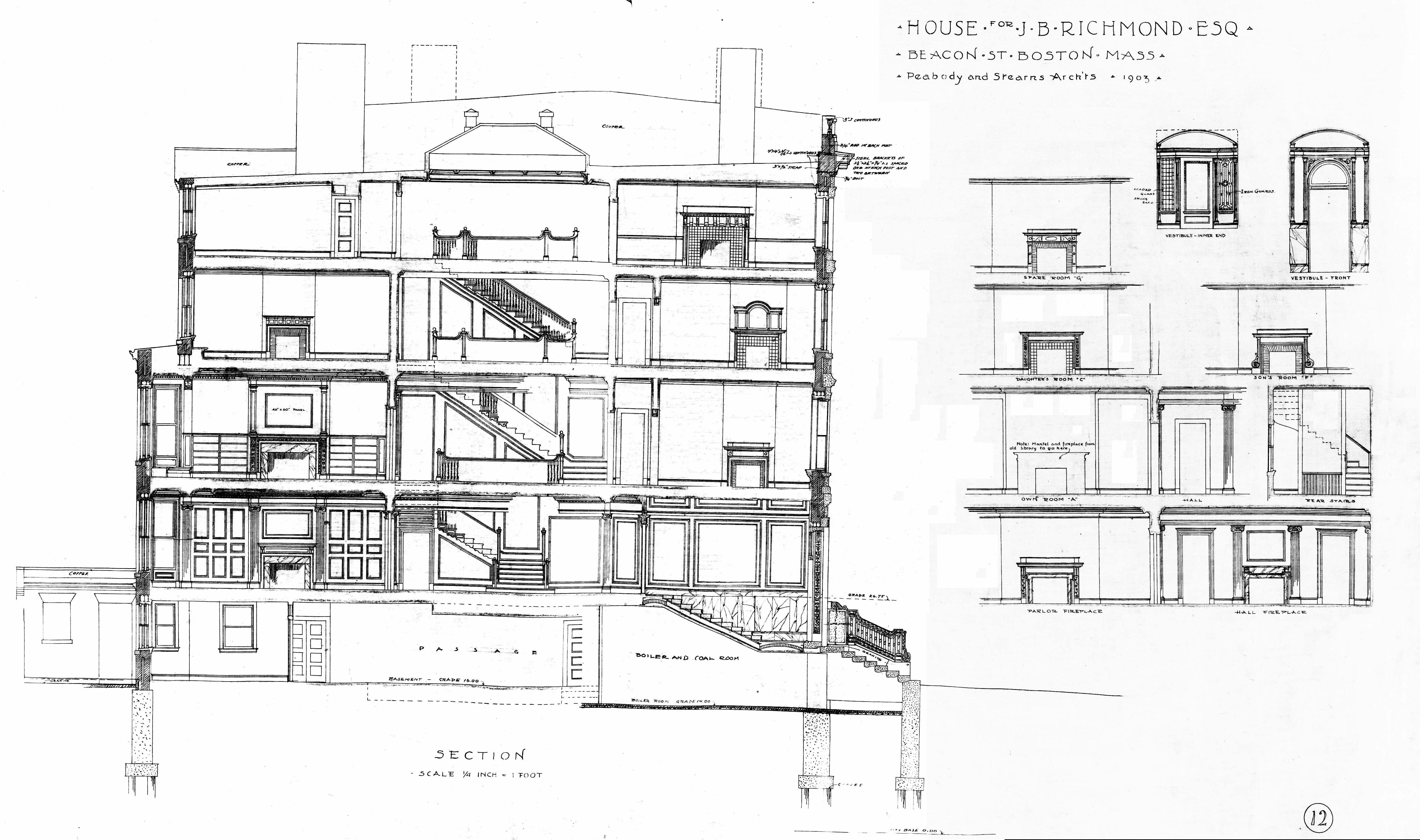 The following drawings of the front and rear elevations, lateral section, floor plans, and plot plan are from the City of Boston Blueprints Collection; the roof plan is from the Peabody and Stearns Collection. All are provided courtesy of the Boston Public Library Arts Department and the Boston City Archives.