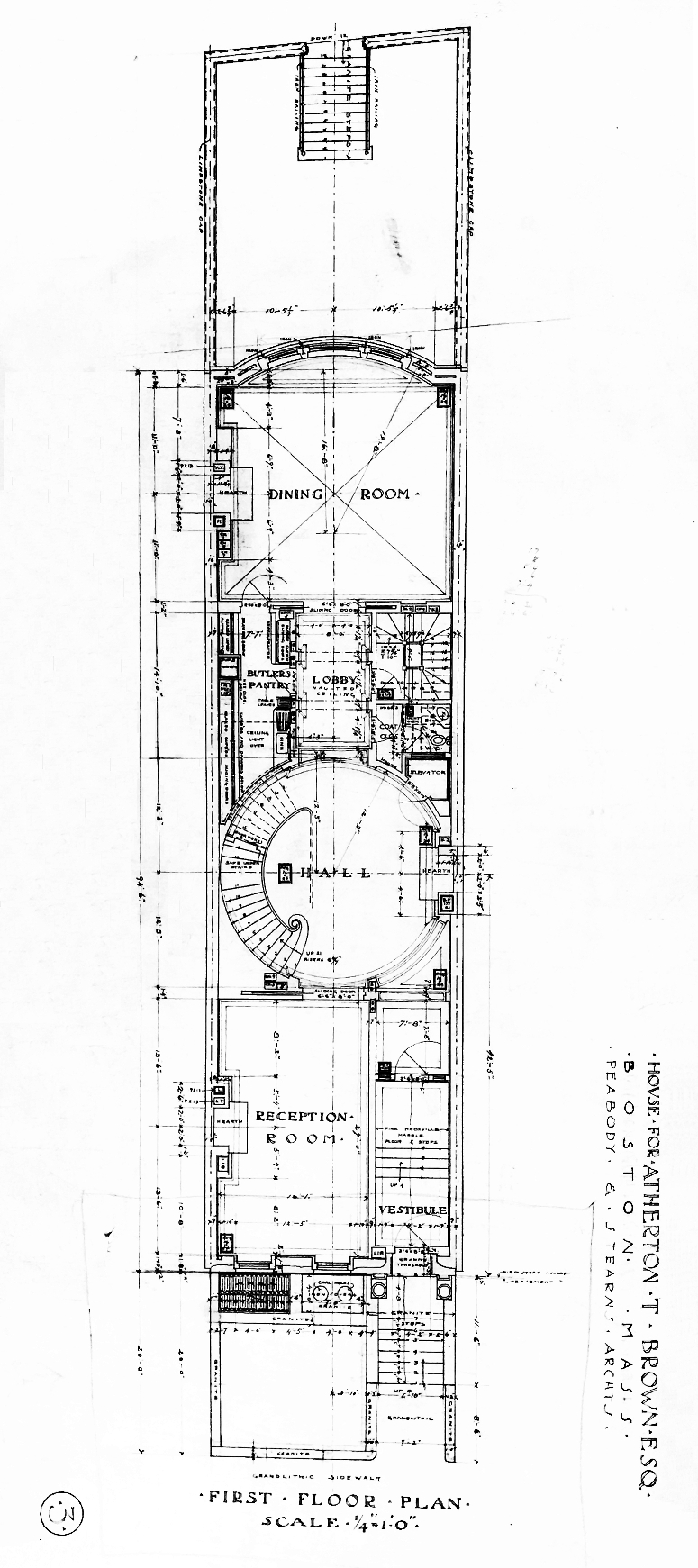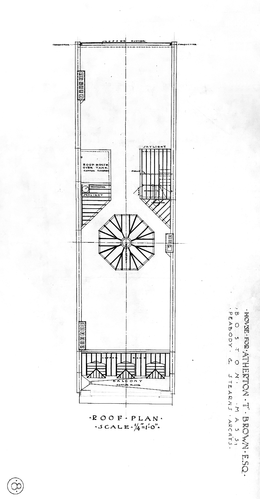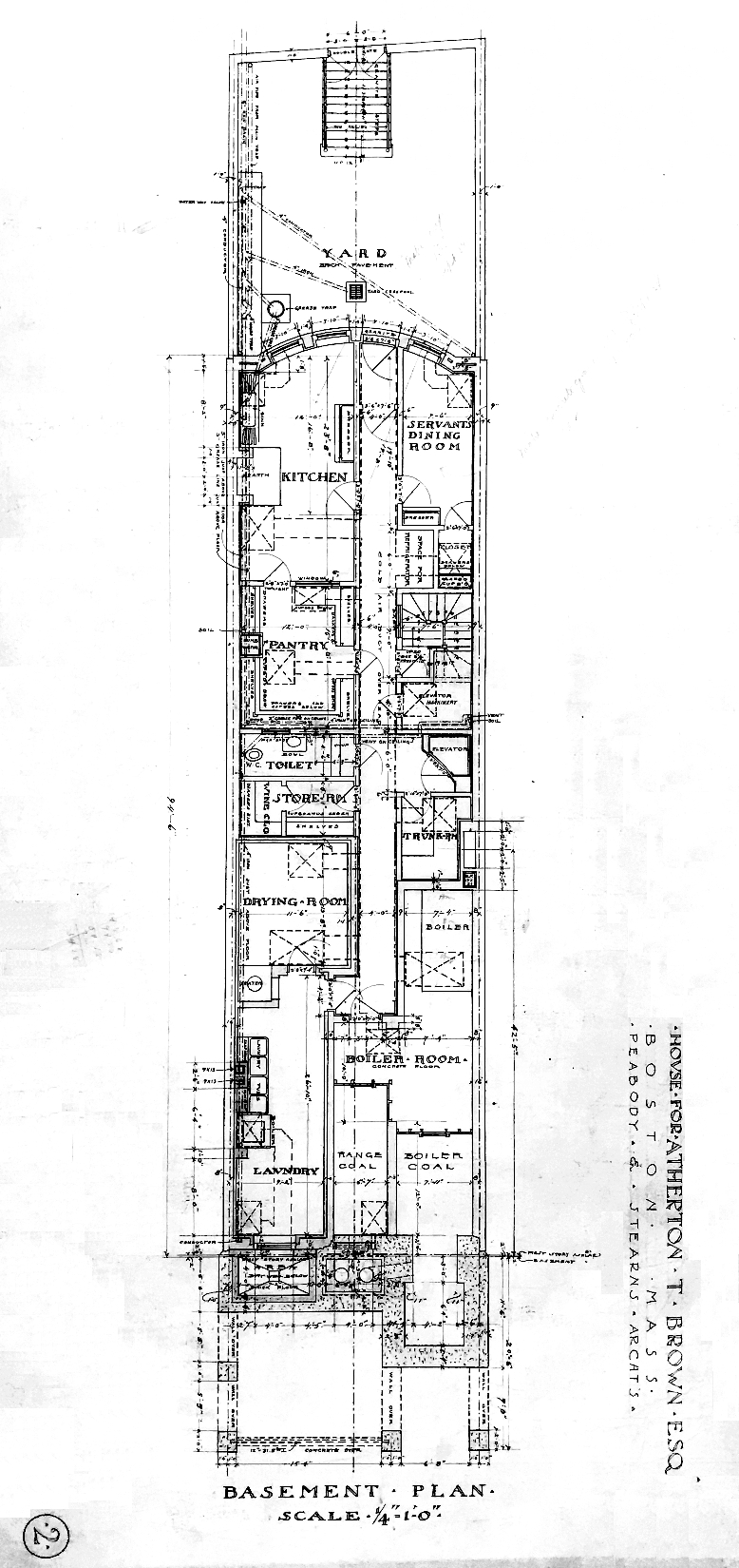 Plans for the house – including elevations, floor plans, framing plans, and detail drawings – are included in the Peabody and Stearns Collection in the Boston Public Library’s Arts Department (reference PS/MA.035). Unfortunately, although the plans include numerous drawings, they no longer include a drawing of the front elevation.