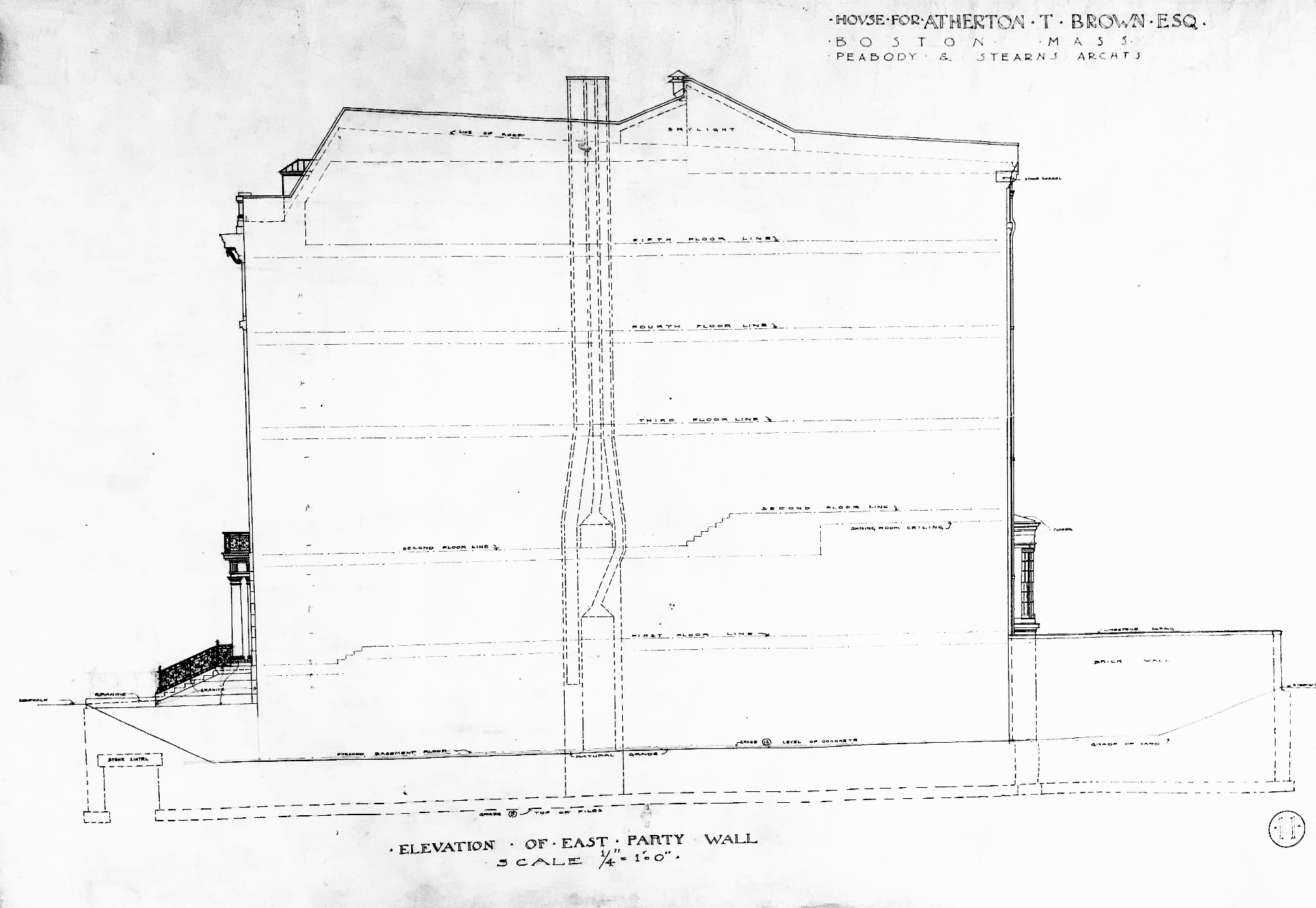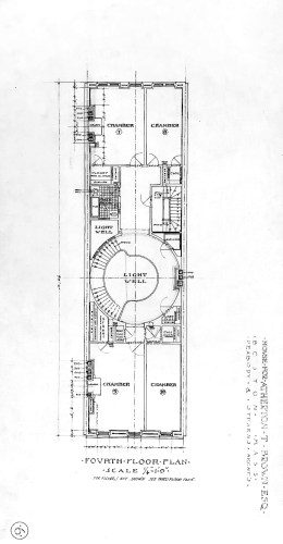 The images below, provided courtesy of the Boston Public Library, include the drawings of the rear elevation (on Marlborough Street), floor plans, longitudinal section, and elevations of the east and west party wall, showing the arrangement of the chimney flues.