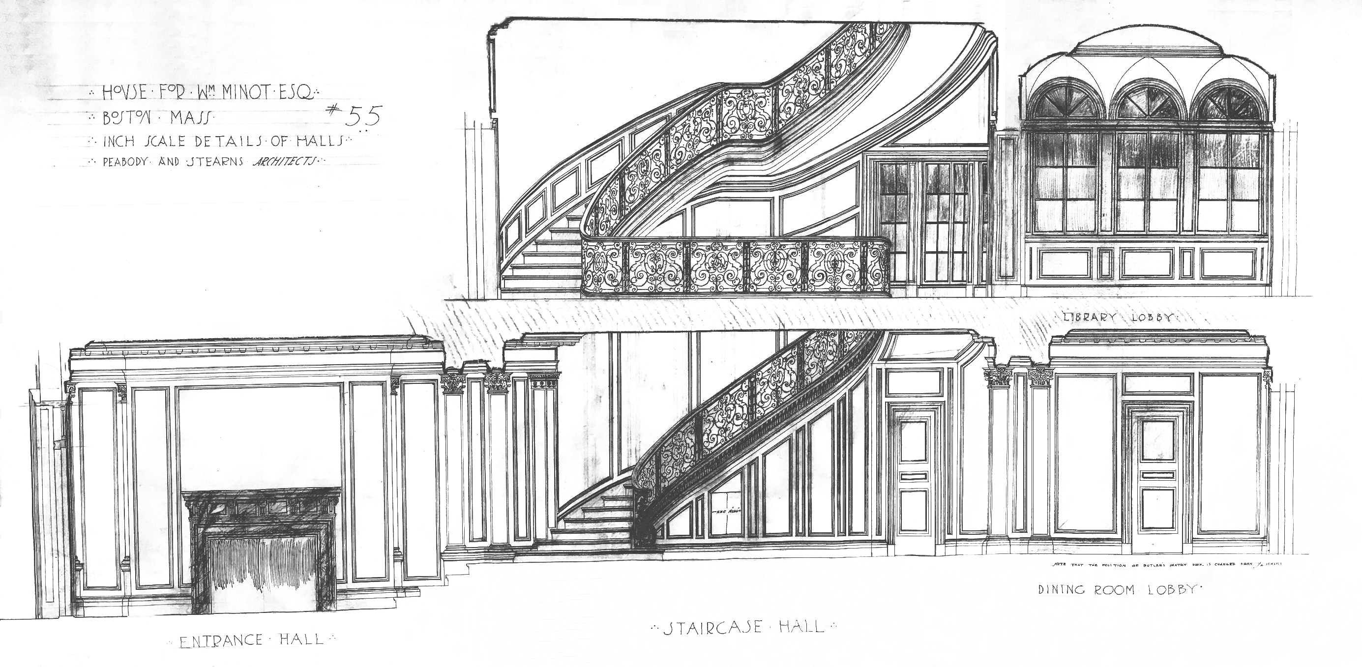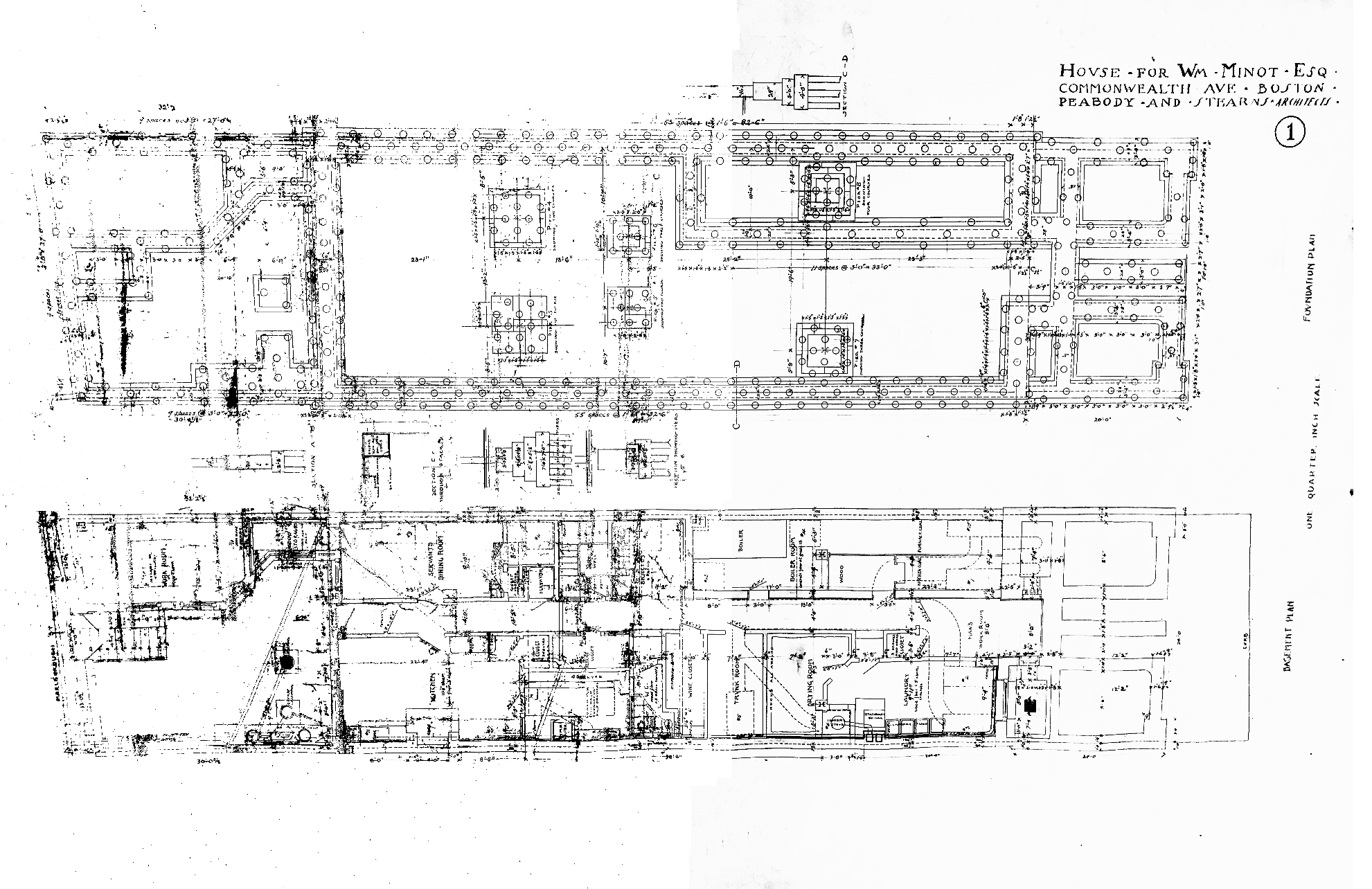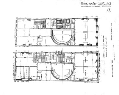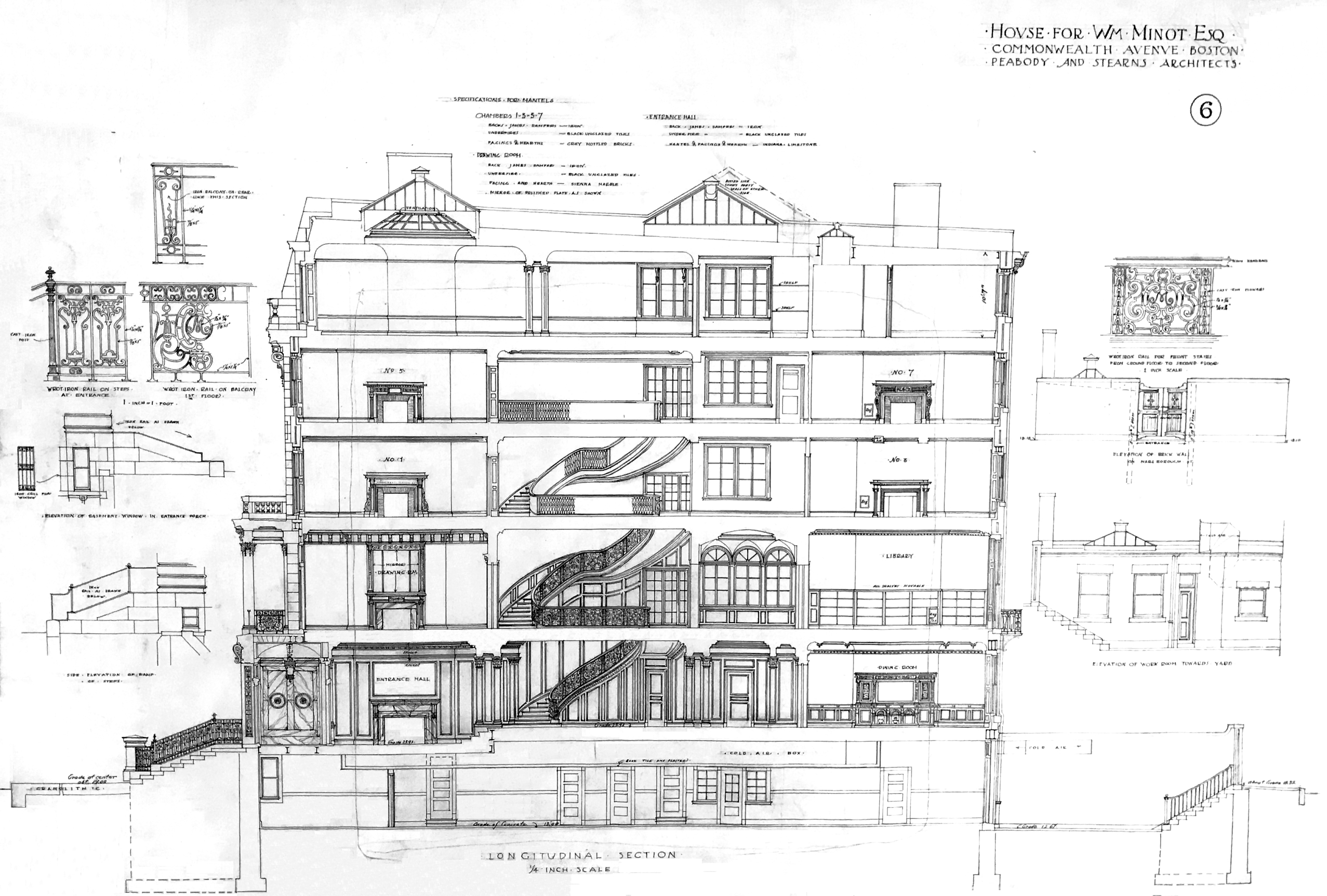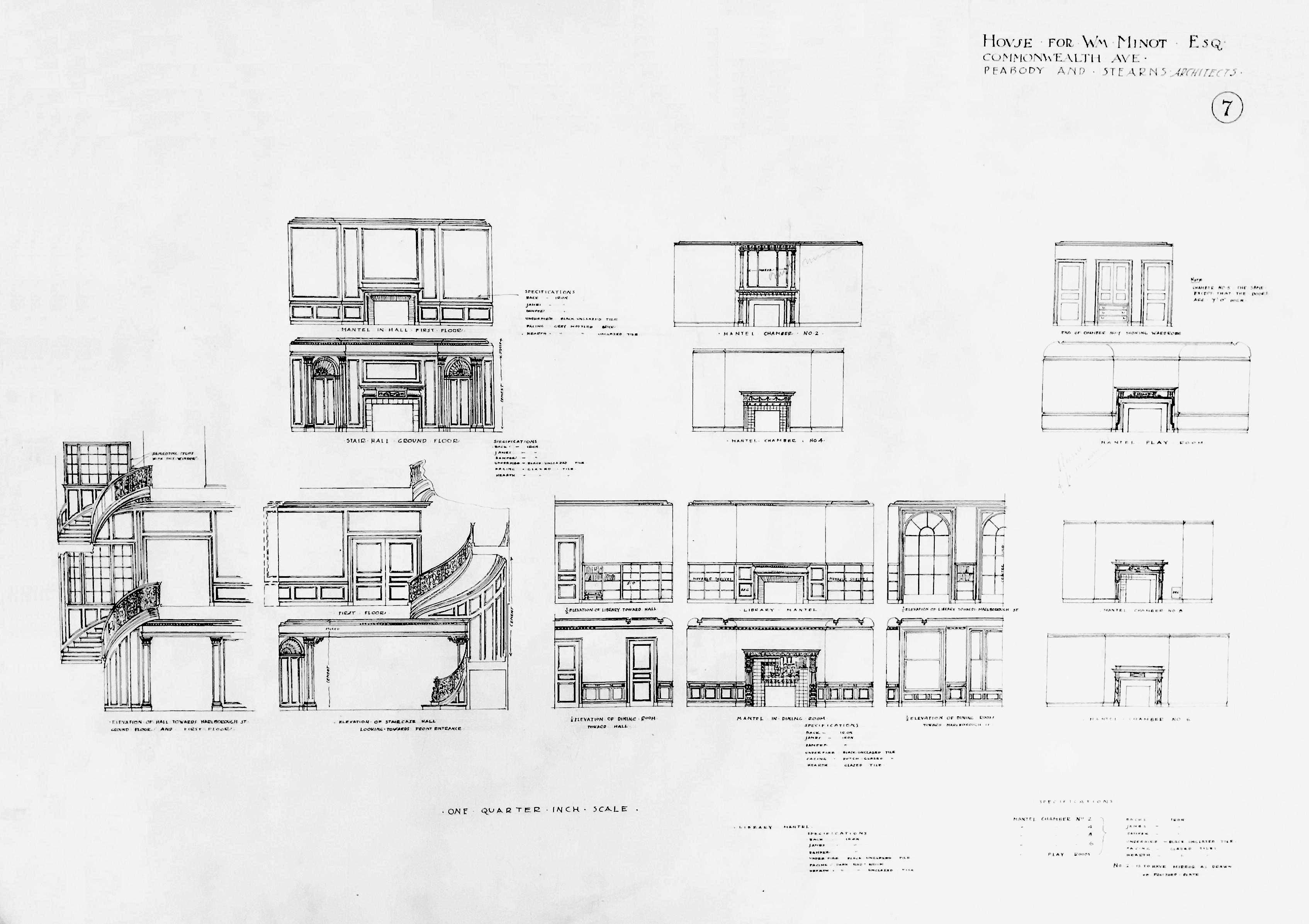 Plans for house are included in the Peabody and Stearns Collection in the Boston Public Library’s Arts Department (reference PS/MA.107). The plans include a large number of drawings, including front and rear (Marlborough Street) elevations, a lateral section, piling and foundation plans, floor plans, framing plans, interior elevations of the first floor stair hall and various other rooms, and detailed drawings of the staircase and other interior features.