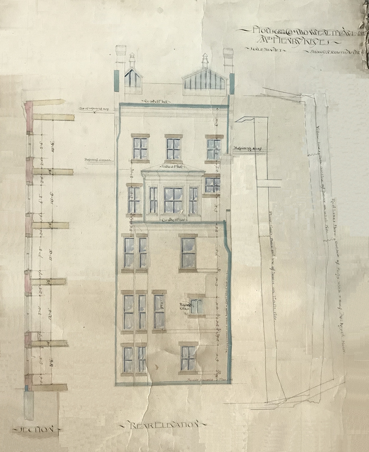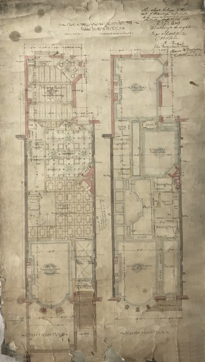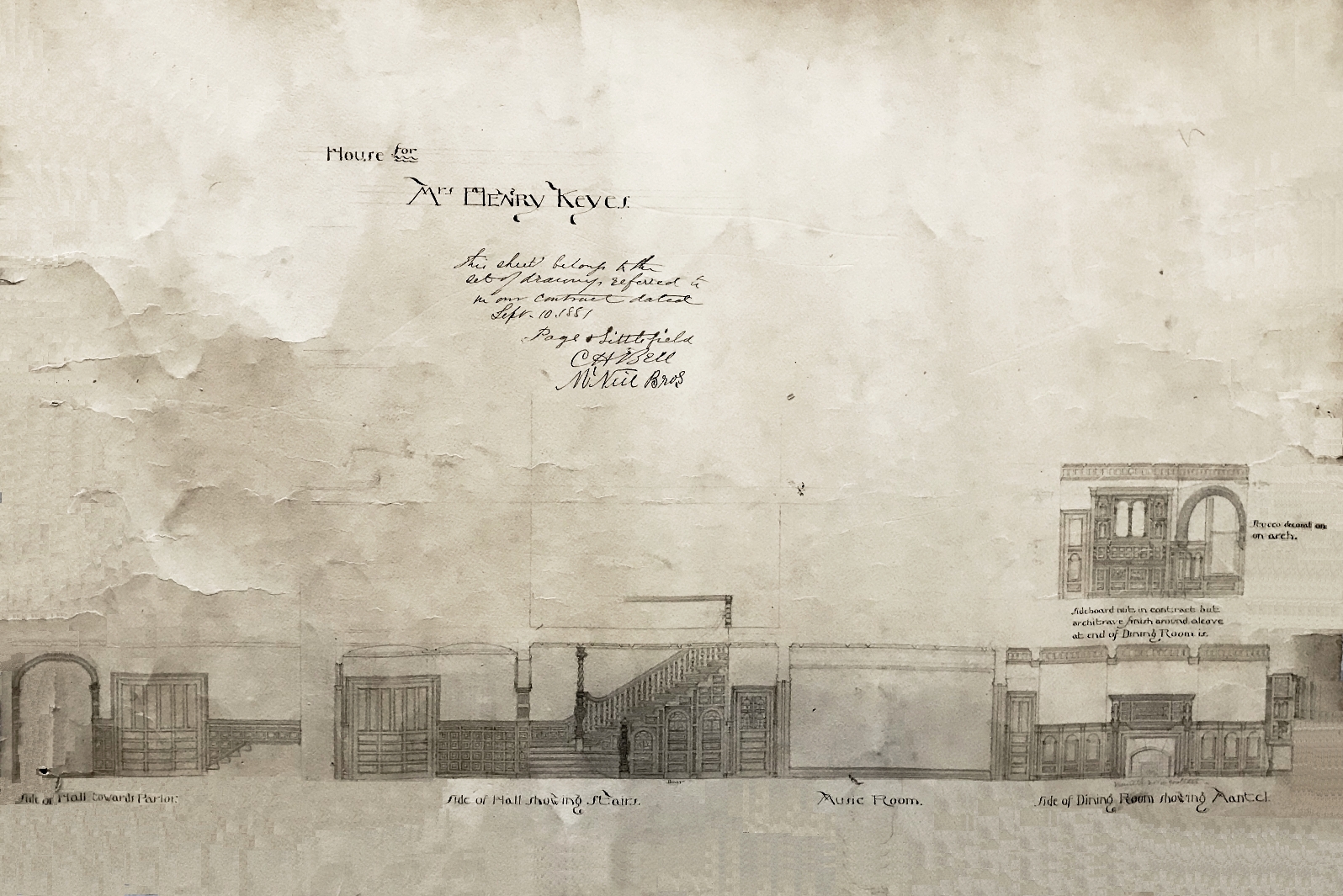 Several of the drawings include notations referring to a September 10, 1881, contract with the firms and individuals who built the house, including Norcross Brothers (builders), McNeil Brothers (carpenters), Woodbury & Leighton (masons), Page & Littlefield (stair builders), Charles H. Bell (painter and decorator), A. Parker (probably Artemas Parker, stone contractor), John Farquahar’s Sons (slaters), Thomas H. Duggan (plumber), L. M. Ham & Co., (blacksmiths and machinists), and Samuel D. Hicks & Son, (coppersmiths) [descriptions of businesses or trades are from the 1881 and 1882 Boston City Directories].