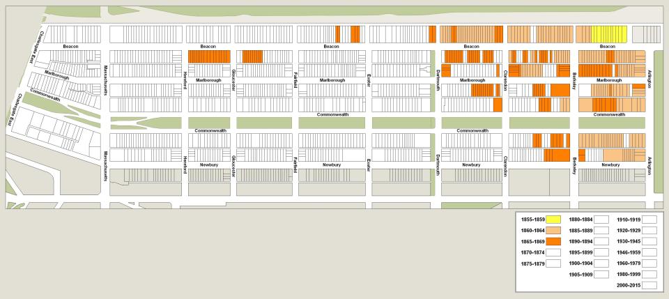 The map below indicates when a building was first constructed on a specific lot through 1869. Included are lots within the residential portion of the Back Bay as defined for purposes of this website, plus buildings on the north side of Newbury. The dates used are based on original permit applications or similar documentation, when available. When no such documentation is available, the dates provided in Bainbridge Bunting’s Houses of Boston’s Back Bay are used.