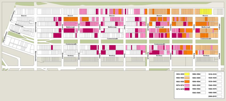 The map below indicates when a building was first constructed on a specific lot through 1879. Included are lots within the residential portion of the Back Bay, as defined for purposes of this website, plus buildings on the north side of Newbury. The dates used are based on original permit applications or similar documentation, when available. When no such documentation is available, the dates provided in Bainbridge Bunting’s Houses of Boston’s Back Bay are used.