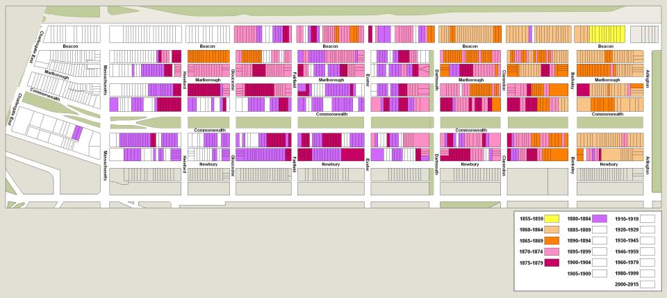 The map below indicates when a building was first constructed on a specific lot through 1884. Included are lots within the residential portion of the Back Bay, as defined for purposes of this website, plus buildings on the north side of Newbury. The dates used are based on original permit applications or similar documentation, when available. When no such documentation is available, the dates provided in Bainbridge Bunting’s Houses of Boston’s Back Bay are used. If an original building was replaced or rebuilt , the date of original building (not the replacement) is shown. Thus, the date shown for 160 Commonwealth (near the southwest corner of Commonwealth and Dartmouth) is the date when the original townhouses built in conjunction with the hotel were constructed (ca. 1871), not the date of the replacement structure (ca. 1881).