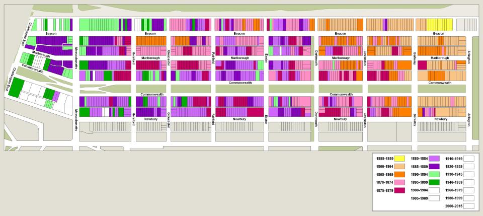The map below indicates when a building was first constructed on a specific lot through 1899. Included are lots within the residential portion of the Back Bay, as defined for purposes of this website, plus buildings on the north side of Newbury. The dates used are based on original permit applications or similar documentation, when available. When no such documentation is available, the dates provided in Bainbridge Bunting’s Houses of Boston’s Back Bay are used. If an original building was replaced or rebuilt , the date of original building (not the replacement) is shown. If a replacement building occupied both a vacant lot and the site of a previous building (e.g., 314 Commonwealth at the southwest corner of Hereford), the vacant lot is shown with the date of the replacement building and the previously occupied lot is shown with the date when the original house was built.