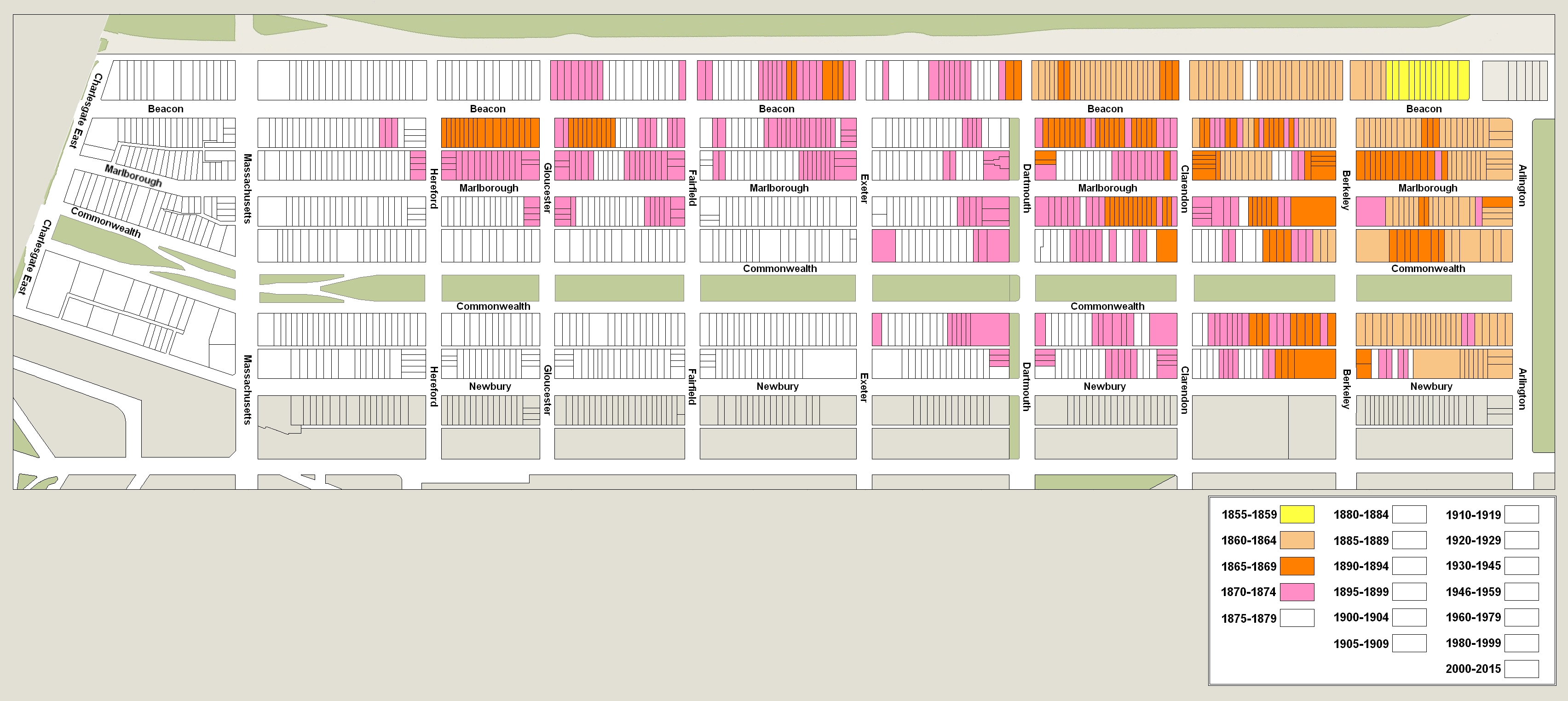 Back Bay Development to 1874 ← Previous Next → Original Construction through 1874 Original construction on vacant lots: to 1874