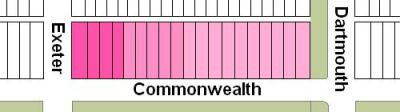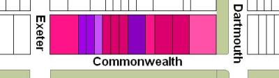 The block on the north side of Commonwealth between Dartmouth and Exeter is 528 feet in length and 124 feet 6 inches from Commonwealth to Alley 425.