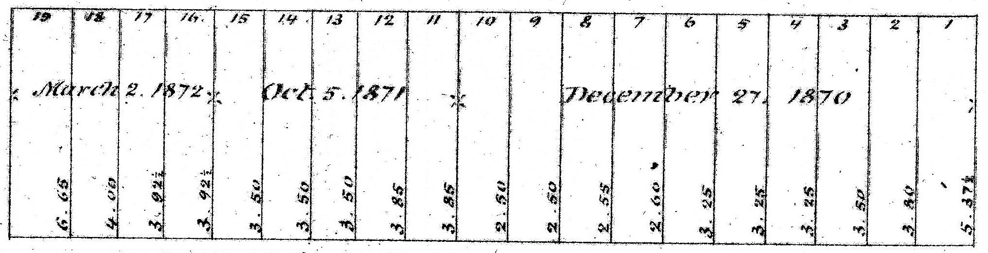 The next five lots (Lots 13-17), all 26 feet wide, had been purchased by George Wheatland, Jr., three (Lots 13-15) at the October 5, 1871, auction, and two more (Lots 16-17) at the March 2, 1872, auction. He either sold or transferred his rights to purchase all five.