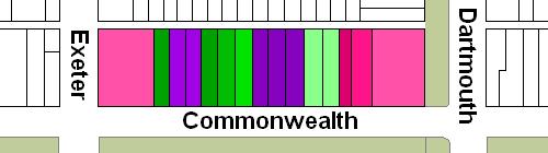 The block on the north side of Commonwealth between Dartmouth and Exeter is 528 feet in length and 124 feet 6 inches from Commonwealth to Alley 425.
