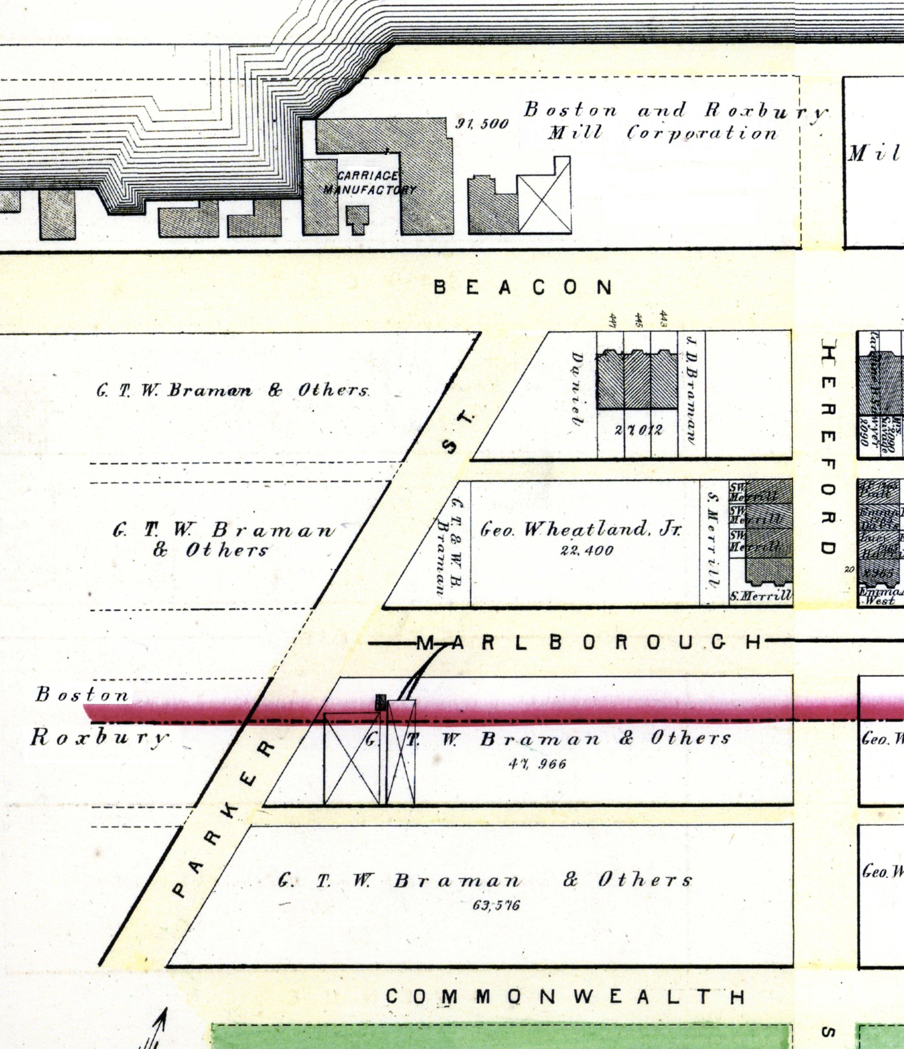 On March 1, 1872, all of the land on the north side of Commonwealth and the south side of Marlborough between Hereford and Massachusetts Avenue, with the exception of the land where Parker Street was located, was purchased from the Boston Water Power Company by a real estate investment trust formed by Grenville T. W. Braman, Henry D. Hyde, and Frank W. Andrews, known as the Beacon Street Lands Trust. The land under Parker Street remained the property of the company.