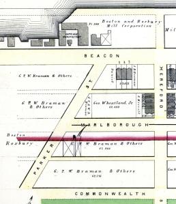 The trust also purchased the land on the north side of Marlborough and the south side of Beacon to the west of Parker Street. The land on the north side of Marlborough and south side of Beacon to the east of Parker Street was purchased by Daniel Davies, a housewright and carpenter, who also was Grenville T. W. Braman’s father-in-law.