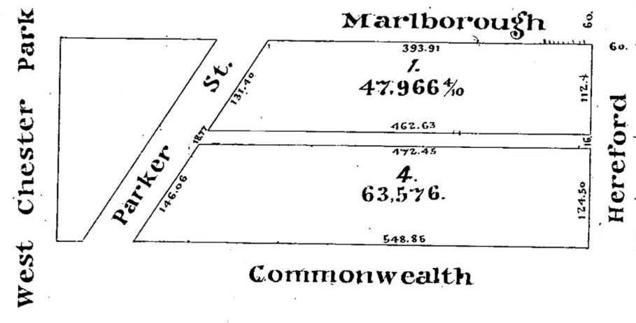 Excerpt from 1872 Plan of land on Marlborough and Commonwealth, between Hereford and West Chester Park (Massachusetts Avenue), showing land on which Parker Street was located; Suffolk County Deed Registry, Book 1095, p. 1