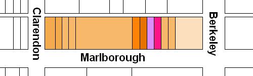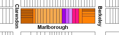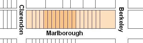 The block on the north side of Marlborough between Berkeley and Clarendon is 548 feet in length and 112 feet from Beacon to Alley 420.