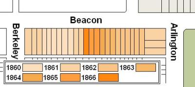 The plan below illustrates when houses were first constructed based on dates provided in Bainbridge Bunting’s Houses of Boston’s Back Bay.